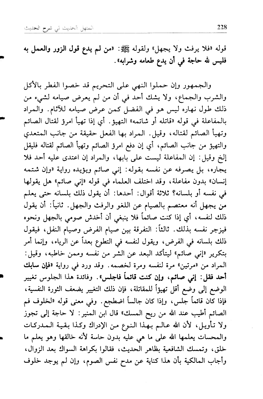 والجمهور وإن حملوا النهي على التحريم قد خصوا الفطر بالأكل والشرب والجماع، ولا يشك أحد في أن من لم يعرض صيامه لشيء من ذلك طول نهاره ليس هو في الفضل كمن عرض صيامه للآثام. والمراد بالمفاعلة في قوله "قاتله أو شاتمه" التهيؤ أي إذا تهيأ امرؤ لقتال الصائم وتهيأ الصائم لقتاله، وقيل. المراد بها الفعل حقيقة من جانب المتعدي والتهيؤ من جانب الصائم، أي إن دفع امرؤ الصائم وتهيأ الصائم لقتاله فليقل إلخ وقيل: إن المفاعلة ليست على بابها، والمراد إن اعتدى عليه أحد فلا يجاره، بل يصرفه عن نفسه بقوله: إني صائم ويؤيده رواية "وإن شتمه إنسان" بدون مفاعلة، وقد اختلف العلماء في قوله "إني صائم" هل يقولها في نفسه أو بلسانه؟ ثلاثة أقوال: أحدها: أن يقول ذلك بلسانه حتى يعلم من يجهل أنه معتصم بالصيام عن اللغو والرفث والجهل. ثانيا: أن يقول ذلك لنفسه، أي إذا كنت صائما فلا ينبغي أن أخدش صومي بالجهل ونحوه فيزجر نفسه بذلك. ثالثا: التفرقة بين صيام الفرض وصيام النفل، فيقول ذلك بلسانه في الفرض، ويقول لنفسه في التطوع بعدا عن الرياء، وإنما أمر بتكرير "إني صائم" ليتأكد البعد عن الشر من نفسه وممن خاطبه، وقيل: المراد من "مرتين" مرة لنفسه ومرة لخصمه، وقد ورد في رواية "فإن سابك أحد فقل: إني صائم، وإن كنت قائما فاجلس". وفائدة هذا الجلوس تغيير الوضع إلى وضع أقل تهيؤا للمقاتلة، فإن ذلك التغيير يضعف الثورة النفسية، فإذا كان قائما جلس، وإذا كان جالسا اضطجع.