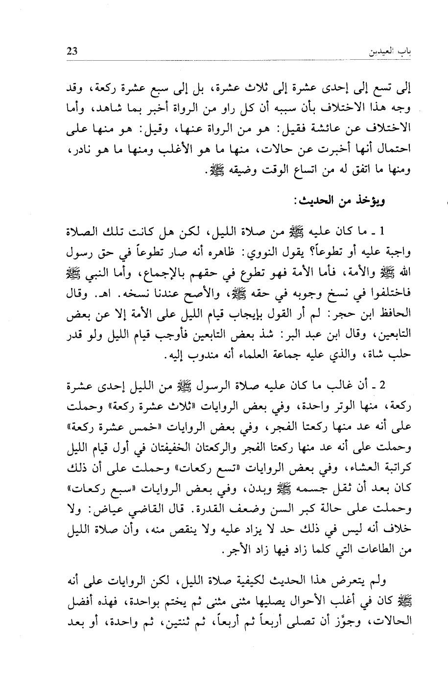 2 - إن غالب ما كان عليه صلاة الرسول صلى الله عليه وسلم من الليل إحدى عشرة ركعة منها الوتر واحدة وفي بعض الروايات "ثلاث عشرة ركعة" وحملت على أنه عد منها ركعتا الفجر وفي بعض الروايات "خمس عشرة ركعة" وحملت على أنه عد منها ركعتا الفجر والركعتان الخفيفتان في أول قيام الليل كراتبة العشاء وفي بعض الروايات "تسع ركعات" وحملت على أن ذلك كان بعد أن ثقل جسمه صلى الله عليه وسلم وبدن وفي بعض الروايات "سبع ركعات" وحملت على حالة كبر السن وضعف القدرة قال القاضي عياض ولا خلاف أنه ليس في ذلك حد لا يزاد عليه ولا ينقص منه وأن صلاة الليل من الطاعات التي كلما زاد فيها زاد الأجر