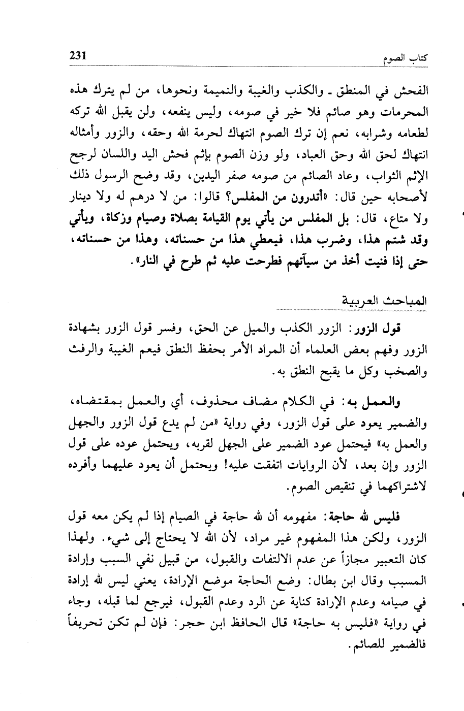 الفحش في المنطق -والكذب والغيبة والنميمة ونحوها، من لم يترك هذه المحرمات وهو صائم فلا خير في صومه، وليس ينفعه، ولن يقبل الله تركه لطعامه وشرابه، نعم إن ترك الصوم انتهاك لحرمة الله وحقه، والزور وأمثاله انتهاك لحق الله وحق العباد، ولو وزن الصوم بإثم فحش اليد واللسان لرجح الإثم الثواب، وعاد الصائم من صومه صفر اليدين، وقد وضح الرسول ذلك لأصحابه حين قال: "أتدرون من المفلس؟ قالوا: من لا درهم له ولا دينار ولا متاع، قال: بل المفلس من يأتي يوم القيامة بصلاة وصيام وزكاة، ويأتي وقد شتم هذا، وضرب هذا، فيعطي هذا من حسناته، وهذا من حسناته، حتى إذا فنيت أخذ من سيئاتهم فطرحت عليه ثم طرح في النار".