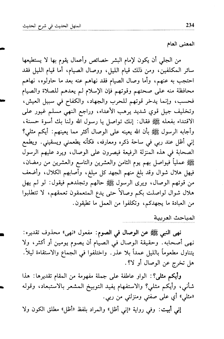 من الجلي أن يكون لإمام البشر خصائص وأعمال يقوم بها لا يستطيعها سائر المكلفين، ومن ذلك قيام الليل، ووصال الصيام، أما قيام الليل فقد احتجب به عنهم، وأما وصال الصيام فقد نهاهم عنه بعد ما حاولوه، نهاهم محافظة منه على صحتهم وقوتهم فإن الإسلام لم يعدهم للصلاة والصيام فحسب، وإنما يدخر قوتهم للحرب والجهاد، والكفاح في سبيل العيش، وتخليف جيل قوي شديد يرهب الأعداء، وراجع النهي مسلم غيور على الاقتداء بفعله صلى الله عليه وسلم فقال: إنك تواصل يا رسول الله ولنا بك أسوة حسنة، وأجابه الرسول صلى الله عليه وسلم بأن الله يعينه على الوصال أكثر مما يعينهم: أيكم مثلي؟ إني أظل عند ربي في ساحة ذكره ومعارفه، فكأنه يطعمني ويسقيني، ويطمع الصحابة في هذه المنزلة الرفيعة فيصرون على الوصال، ويرد عليهم الرسول صلى الله عليه وسلم عمليا فيواصل بهم يوم الثامن والعشرين والتاسع والعشرين من رمضان، فيهل هلال شوال وقد بلغ منهم الجهد كل مبلغ، وأصابهم الكلال، وأضعف من قوتهم الوصال، ويرى الرسول صلى الله عليه وسلم حالهم وتجلدهم فيقول: لو لم يهل هلال شوال لواصلت بكم وصالا حتى يدع المتعمقون تعمقهم، لا تتطلبوا من العبادة ما يجهدكم، وتكلفوا من العمل ما تطيقون.