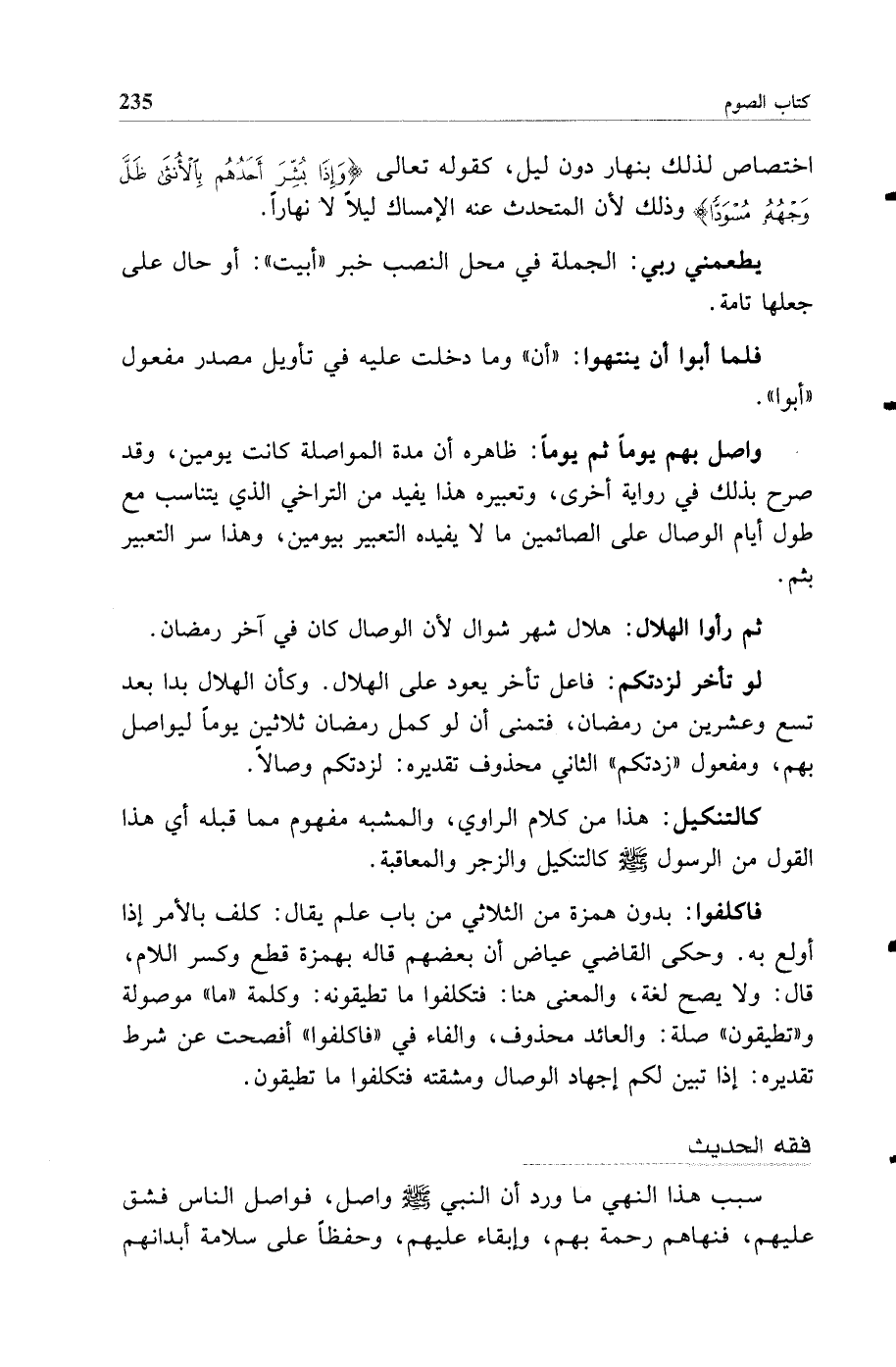 (واصل بهم يوما ثم يوما) ظاهره أن مدة المواصلة كانت يومين، وقد صرح بذلك في رواية أخرى، وتعبيره هذا يفيد من التراخي الذي يتناسب مع طول أيام الوصال على الصائمين ما لا يفيده التعبير بيومين، وهذا سر التعبير بثم.