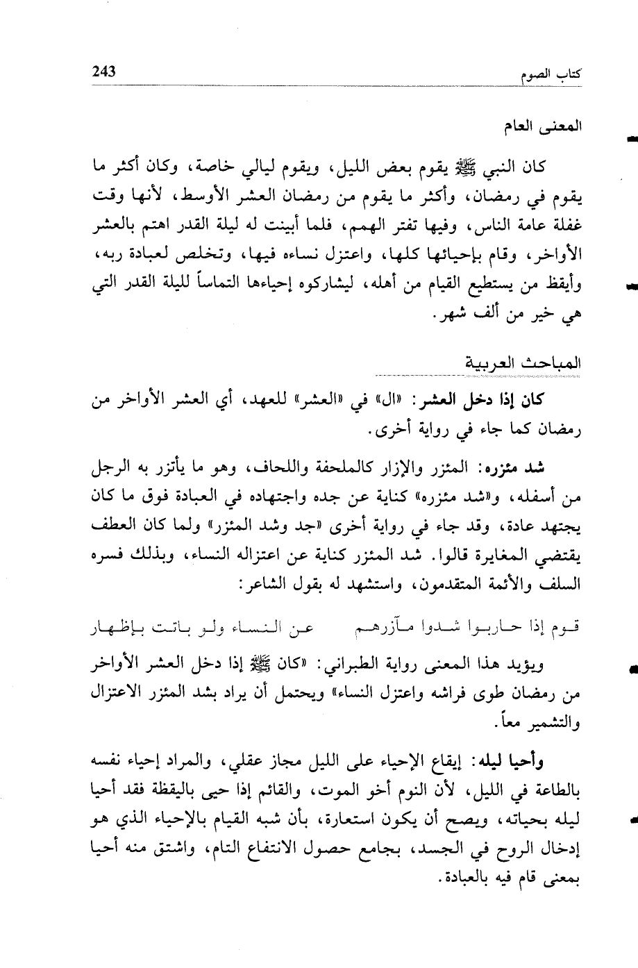 (شد مئزره) المئزر والإزار كالملحفة واللحاف، وهو ما يأتزر به الرجل من أسفله، و"شد مئزره" كناية عن جده واجتهاده في العبادة فوق ما كان يجتهد عادة، وقد جاء في رواية أخرى "جد وشد المئزر" ولما كان العطف يقتضي المغايرة قالوا، شد المئزر كناية عن اعتزاله النساء، وبذلك فسره السلف والأئمة المتقدمون، واستشهد له بقول الشاعر: