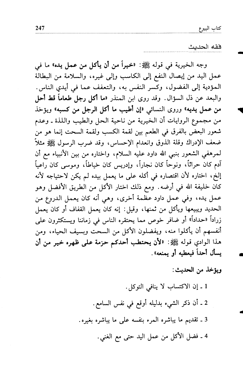 وجه الخيرية في قوله صلى الله عليه وسلم "خيرا من أن يأكل من عمل يده" ما في عمل اليد من إيصال النفع إلى الكاسب وإلى غيره، والسلامة من البطالة المؤدية إلى الفضول، وكسر النفس به، والتعفف عما في أيدي الناس. والبعد عن ذل السؤال. وقد روى ابن المنذر "ما أكل رجل طعاما قط أحل من عمل يديه" وروى النسائي "إن أطيب ما أكل الرجل من كسبه" ويؤخذ من مجموع الروايات أن الخيرية من ناحية الحل والطيب واللذة- وعدم شعور البعض بالفرق في الطعم بين لقمة الكسب ولقمة السحت إنما هو من ضعف الإدراك وقلة الذوق وانعدام الإحساس، وقد ضرب الرسول صلى الله عليه وسلم مثلا لمرهفي الشعور بنبي الله داود عليه السلام، واختاره من بين الأنبياء مع أن آدم كان حراثا، ونوحا كان نجارا، وإدريس كان خياطا، وموسى كان راعيا إلخ، اختاره لأن اقتصاره في أكله على ما يعمل بيده لم يكن لاحتياجه لأنه كان خليفة الله في أرضه. ومع ذلك اختار الأكل من الطريق الأفضل وهو عمل يده، وفي عمل داود عظمة أخرى، وهي أنه كان يعمل الدروع من الحديد ويبيعها ويأكل من ثمنها، وقيل: إنه كان يعمل القفاف أو كان يعمل زرادا "حدادا" أو ضافر خوص مما يحتقره الناس في زماننا ويستكثرون على أنفسهم أن يأكلوا منه، ويفضلون الأكل من السحت وبسيف الحياء، ومن هذا الوادي قوله صلى الله عليه وسلم "لأن يحتطب أحدكم حزمة على ظهره خير من أن يسأل أحدا فيعطيه أو يمنعه".