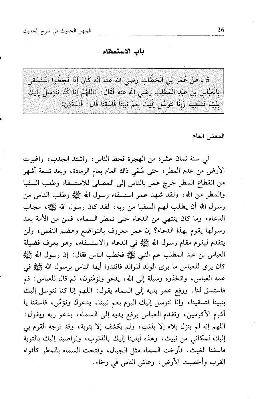 5 - عن عمر بن الخطاب رضي الله عنه أنه كان إذا قحطوا استسقى بالعباس بن عبد المطلب رضي الله عنه فقال: "اللهم إن كنا نتوسل إليك بنبينا فتسقينا وإنا نتوسل إليك بعم نبينا فاسقنا قال: فيسقون"