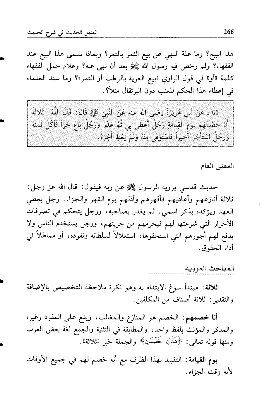 61 - عن أبي هريرة رضي الله عنه عن النبي صلى الله عليه وسلم قال: قال الله ثلاثة أنا خصمهم يوم القيامة رجل أعطى بي ثم غدر ورجل باع حرا فأكل ثمنه ورجل استأجر أجيرا فاستوفى منه ولم يعط أجره.