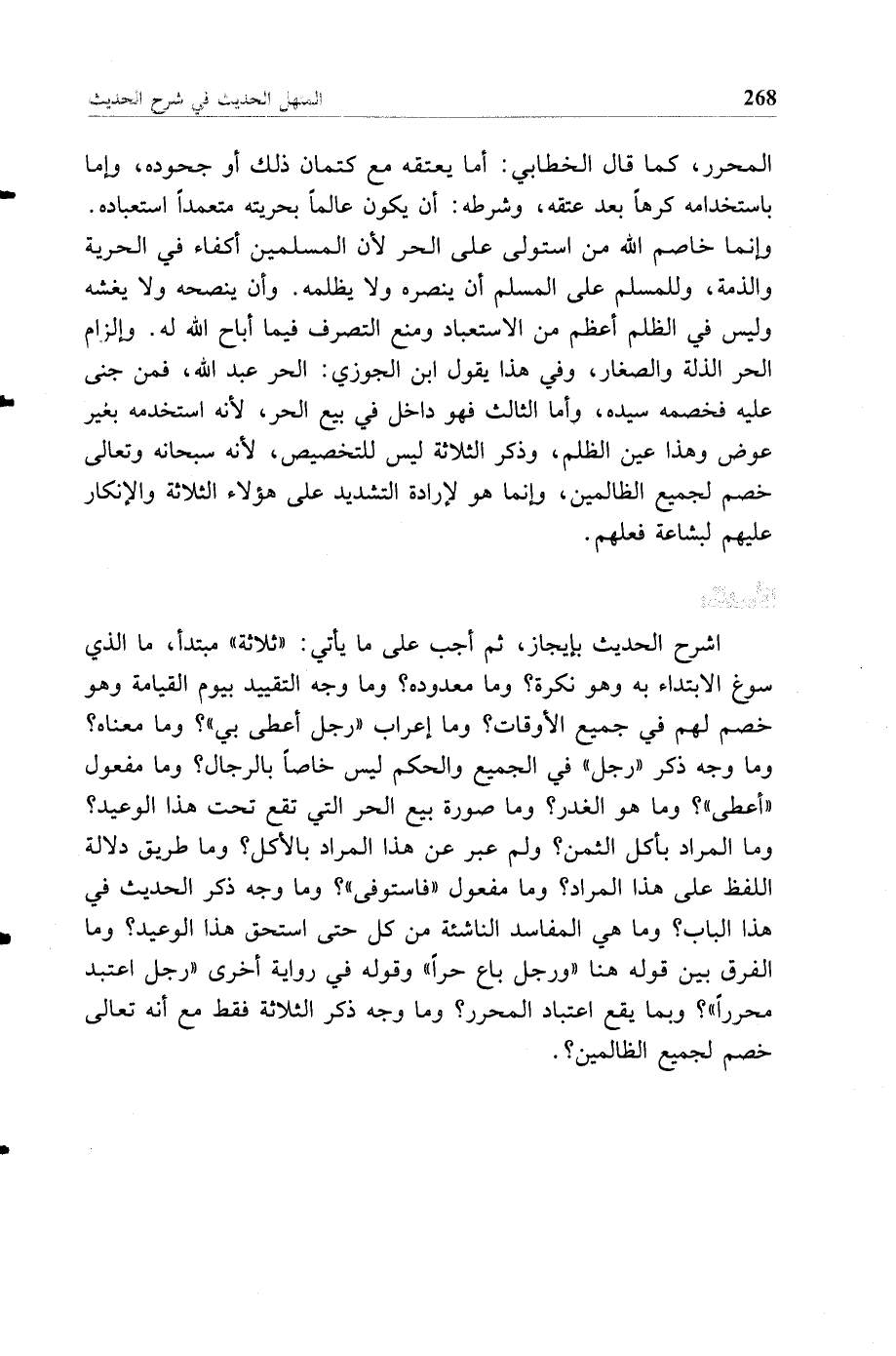 المحرر، كما قال الخطابي: إما يعتقه مع كتمان ذلك أو جحوده، وإما باستخدامه كرها بعد عتقه، وشرطه: أن يكون عالما بحريته متعمدا استعباده. وإنما خاصم الله من استولى على الحر لأن المسلمين أكفاء في الحرية والذمة، وللمسلم على المسلم أن ينصره ولا يظلمه. وأن ينصحه ولا يغشه وليس في الظلم أعظم من الاستعباد ومنع التصرف فيما أباح الله له. وإلزام الحر الذلة والصغار، وفي هذا يقول ابن الجوزي: الحر عبد الله، فمن جنى عليه فخصمه سيده، وأما الثالث فهو داخل في بيع الحر، لأنه استخدمه بغير عوض وهذا عين الظلم، وذكر الثلاثة ليس للتخصيص، لأنه سبحانه وتعالى خصم لجميع الظالمين، وإنما هو لإرادة التشديد على هؤلاء الثلاثة والإنكار عليهم لبشاعة فعلهم.