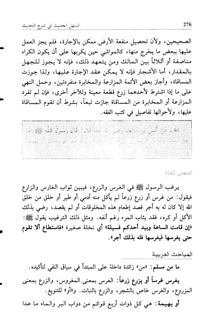 يرغب الرسول صلى الله عليه وسلم في الغرس والزرع، فيبين ثواب الغارس والزارع فيقول: من غرس أو زرع زرعا لم يأكل منه آدمي أو طير أو خلق من خلق الله إلا كان له به أجر قصد إطعام هذه المخلوقات أو لم يقصد، رضي بذلك الأكل أو كره، فقد يثاب المرء رغم أنفه. ومثل ذلك الترغيب يقول صلى الله عليه وسلم: "إن قامت الساعة وبيد أحدكم فسيلة" أي نخلة صغيرة "فاستطاع ألا تقوم حتى يغرسها فيغرسها" فله بذلك أجر.