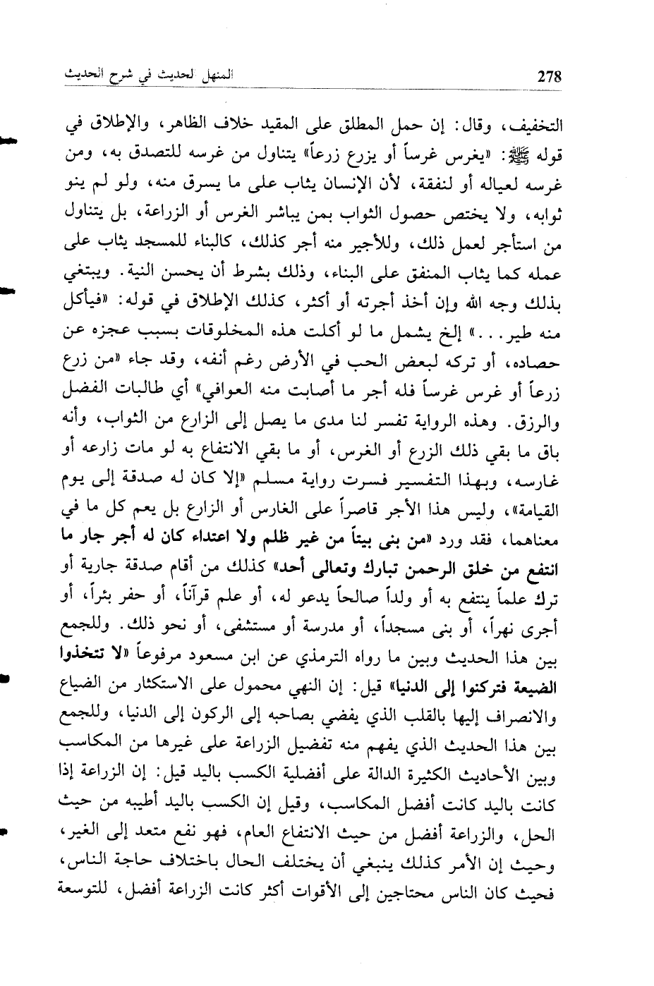 ويبتغي بذلك وجه الله وإن أخذ أجرته أو أكثر، كذلك الإطلاق في قوله "فيأكل منه طير ... " إلخ يشمل ما لو أكلت هذه المخلوقات بسبب عجزه عن حصاده، أو تركه لبعض الحب في الأرض رغم أنفه، وقد جاء "من زرع زرعا أو غرس غرسا فله أجر ما أصابت منه العوافي" أي طالبات الفضل والرزق. وهذه الرواية تفسر لنا مدى ما يصل إلى الزارع من الثواب، وأنه باق ما بقي ذلك الزرع أو الغرس، أو ما بقي الانتفاع به لو مات زارعه أو غارسه، وبهذا التفسير فسرت رواية مسلم "إلا كان له صدقة إلى يوم القيامة"، وليس هذا الأجر قاصرا على الغارس أو الزارع بل يعم كل ما في معناهما، فقد ورد "من بنى بيتا في غير ظلم ولا اعتداء كان له أجر جار ما انتفع من خلق الرحمن تبارك وتعالى أحد" كذلك من أقام صدقة جارية أو ترك علما ينتفع به أو ولدا صالحا يدعو له، أو علم قرآنا، أو حفر بئرا، أو أجرى نهرا، أو بنى مسجدا، أو مدرسة أو مستشفى، أو نحو ذلك. وللجمع بين هذا الحديث وبين ما رواه الترمذي عن ابن مسعود مرفوعا "لا تتخذوا الضيعة فتركنوا إلى الدنيا" قيل: إن النهي محمول على الاستكثار من الضياع والانصراف إليها بالقلب الذي يفضي بصاحبه إلى الركون إلى الدنيا، وللجمع بين هذا الحديث الذي يفهم منه تفضيل الزراعة على غيرها من المكاسب وبين الأحاديث الكثيرة الدالة على أفضلية الكسب باليد قيل: إن الزراعة إذا كانت باليد كانت أفضل المكاسب، وقيل إن الكسب باليد أطيبه من حيث الحل، والزراعة أفضل من حيث الانتفاع العام، فهو نفع متعد إلى الغير، وحيث أن الأمر كذلك ينبغي أن يختلف الحال باختلاف حاجة الناس، فحيث كان الناس محتاجين إلى الأقوات أكثر كانت الزراعة أفضل، للتوسعة