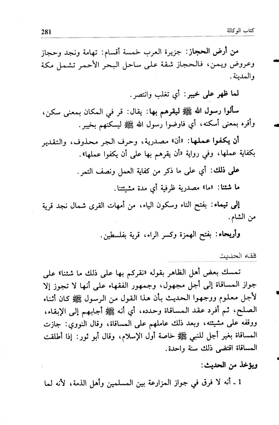 تمسك بعض أهل الظاهر بقوله "نقركم بها على ذلك ما شئنا" على جواز المساقاة إلى أجل مجهول، وجمهور الفقهاء على أنها لا تجوز إلا لأجل معلوم ووجهوا الحديث بأن هذا القول من الرسول صلى الله عليه وسلم كان أثناء الصلح، ثم أفرد عقد المساقاة وحدده، أي أنه صلى الله عليه وسلم أجابهم إلى الإبقاء، ووقفه على مشيئته، وبعد ذلك عاملهم على المساقاة، وقال النووي: جازت المساقاة بغير أجل للنبي صلى الله عليه وسلم خاصة أول الإسلام، وقال أبو ثور: إذا أطلقت المساقاة اقتضى ذلك سنة واحدة.