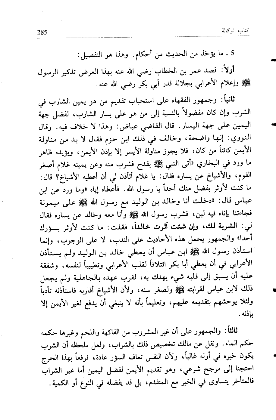 ثانيا: وجمهور الفقهاء على استحباب تقديم من هو يمين الشارب في الشرب وإن كان مفضولا بالنسبة إلى من هو على يسار الشارب، لفضل جهة اليمين على جهة اليسار. قال القاضي عياض: وهذا لا خلاف فيه. وقال النووي: إنها واضحة، وخالف في ذلك ابن حزم فقال لا بد من مناولة الأيمن كائنا من كان، فلا يجوز مناولة الأيسر إلا بإذن الأيمن، ويؤيده ظاهر ما ورد في البخاري "أتى النبي صلى الله عليه وسلم بقدح فشرب منه وعن يمينه غلام أصغر القوم، والأشياخ عن يساره فقال: يا غلام أتأذن لي أن أعطيه الأشياخ؟ قال: ما كنت لأوثر بفضل منك أحدا يا رسول الله. فأعطاه إياه" وما ورد عن ابن عباس قال: "دخلت أنا وخالد بن الوليد مع رسول الله صلى الله عليه وسلم على ميمونة فجاءتنا بإناء فيه لبن، فشرب رسول الله صلى الله عليه وسلم وأنا معه وخالد عن يساره فقال لي: الشربة لك، وإن شئت آثرت خالدا، فقلت: ما كنت لأوثر بسؤرك أحدا" والجمهور يحمل هذه الأحاديث على الندب، لا على الوجوب، وإنما استأذن رسول الله صلى الله عليه وسلم ابن عباس أن يعطي خالد بن الوليد ولم يستأذن الأعرابي في أن يعطي أبا بكر ائتلافا لقلب الأعرابي وتطييبا لنفسه، وشفقة عليه أن يسبق إلى قلبه شيء يهلك به، لقرب عهده بالجاهلية ولم يجعل ذلك لابن عباس لقرابته صلى الله عليه وسلم ولصغر سنه، ولأن الأشياخ أقاربه فاستأذنه تأدبا ولئلا يوحشهم بتقديمه عليهم، وتعليما بأنه لا ينبغي أن يدفع لغير الأيمن إلا بإذنه.