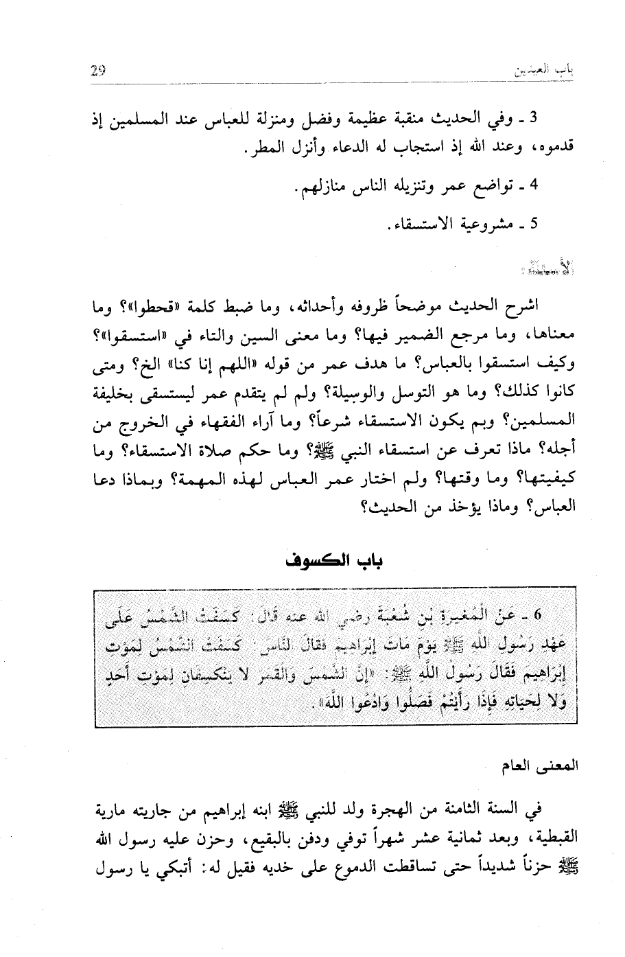 6 - عن المغيرة بن شعبة رضي الله عنه قال: كسفت الشمس على عهد رسول الله صلى الله عليه وسلم يوم مات إبراهيم فقال الناس كسفت الشمس لموت إبراهيم فقال رسول الله صلى الله عليه وسلم "إن الشمس والقمر لا ينكسفان لموت أحد ولا لحياته فإذا رأيتم فصلوا وادعوا الله"