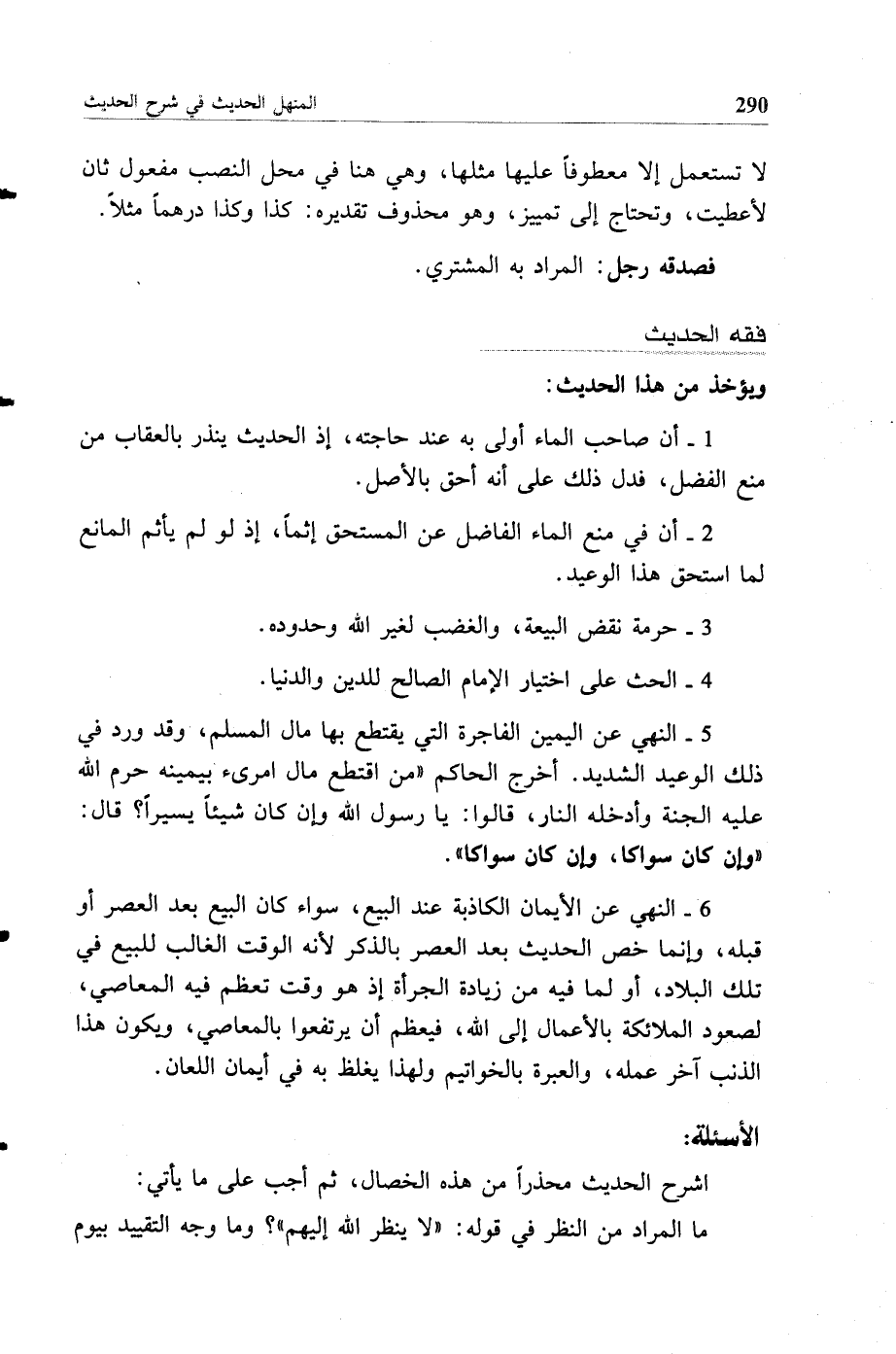 6 - النهي عن الأيمان الكاذبة عند البيع، سواء كان البيع بعد العصر أو قبله، وإنما خص الحديث بعد العصر بالذكر لأنه الوقت الغالب للبيع في تلك البلاد، أو لما فيه من زيادة الجرأة إذ هو وقت تعظم فيه المعاصي، لصعود الملائكة بالأعمال إلى الله، فيعظم أن يرتفعوا بالمعاصي، ويكون هذا الذنب آخر عمله، والعبرة بالخواتيم ولهذا يغلظ به في أيمان اللعان.