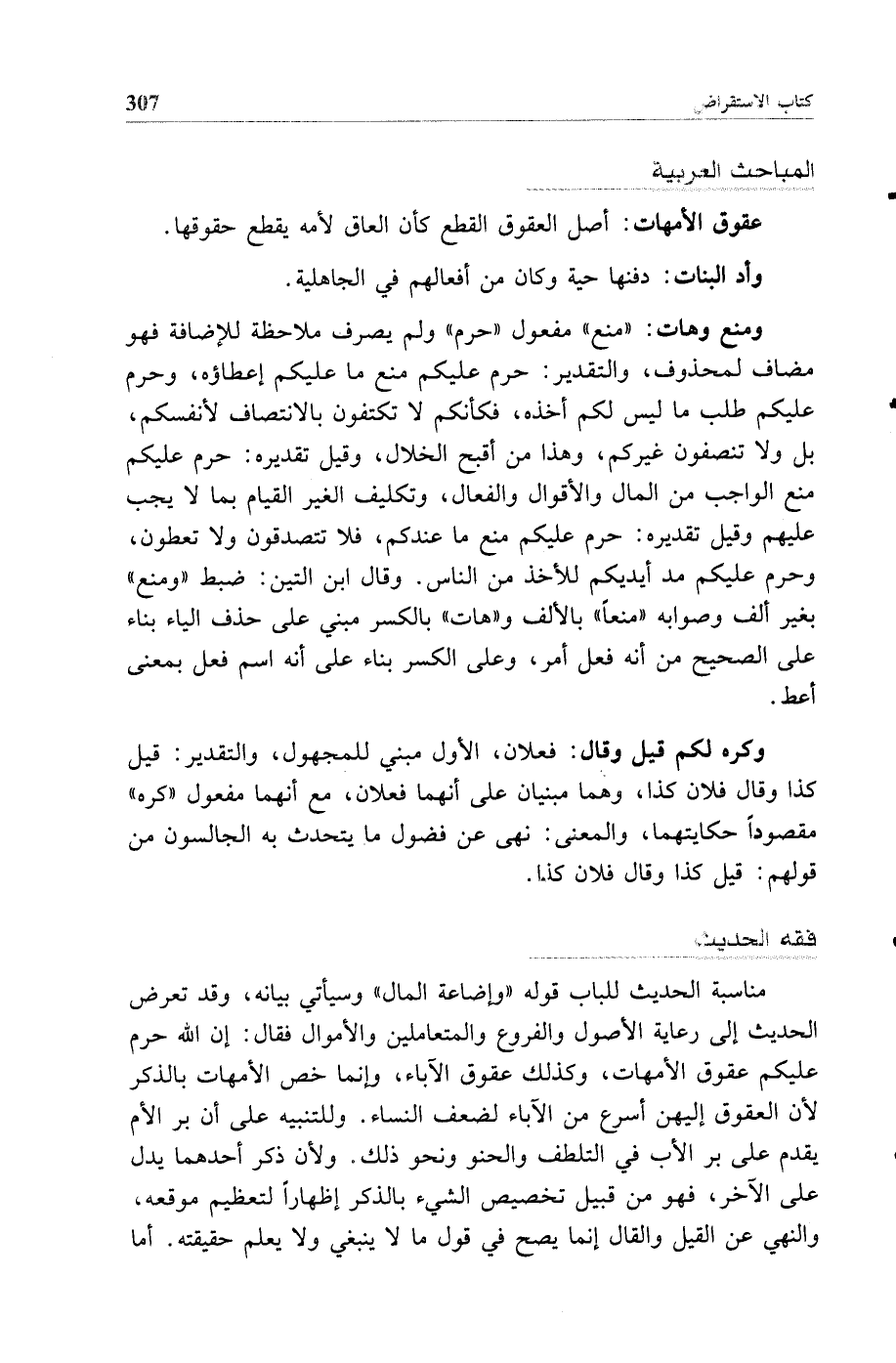 (عقوق الأمهات) أصل العقوق القطع كأن العاق لأمه يقطع حقوقها.
