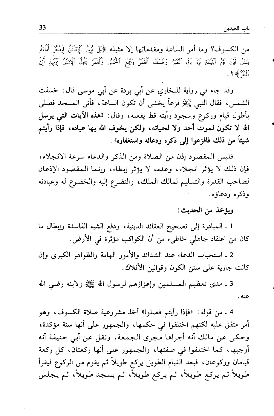 4 - من قوله "فإذا رأيتم فصلوا" أخذ مشروعية صلاة الكسوف وهو أمر متفق عليه لكنهم اختلفوا في حكمها والجمهور على أنها سنة مؤكدة وحكي عن مالك أنه أجراها مجرى الجمعة ونقل عن أبي حنيفة أنه أوجبها كما اختلفوا في صفتها والجمهور على أنها ركعتان كل ركعة قيامان وركوعان فبعد القيام الطويل يركع طويلا ثم يقوم من الركوع فيقرأ طويلا ثم يركع طويلا ثم يركع طويلا ثم يسجد طويلا ثم يجلس