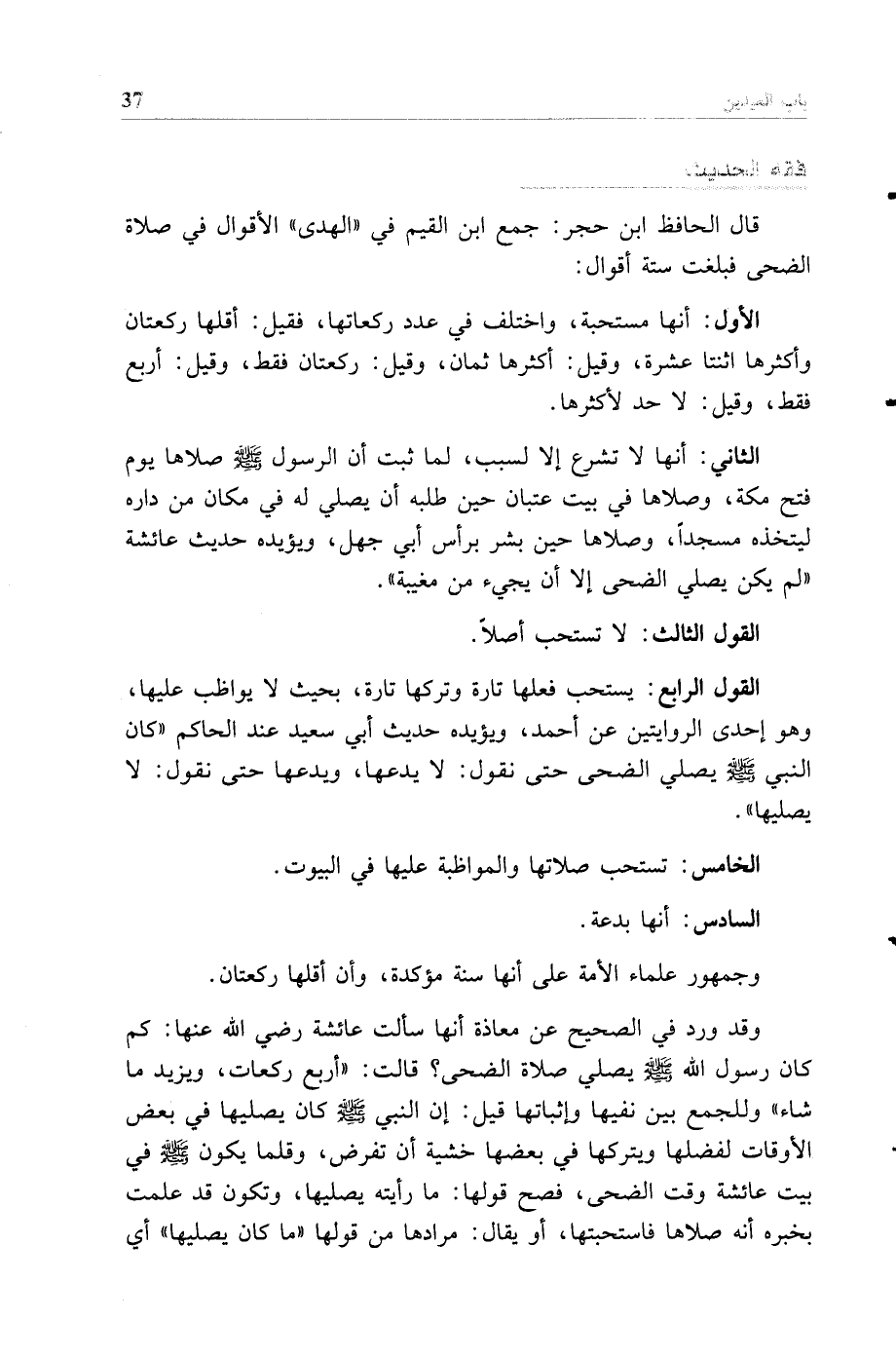 قال الحافظ ابن حجر جمع ابن القيم في الهدي الأقوال في صلاة الضحى فبلغت ستة أقوال