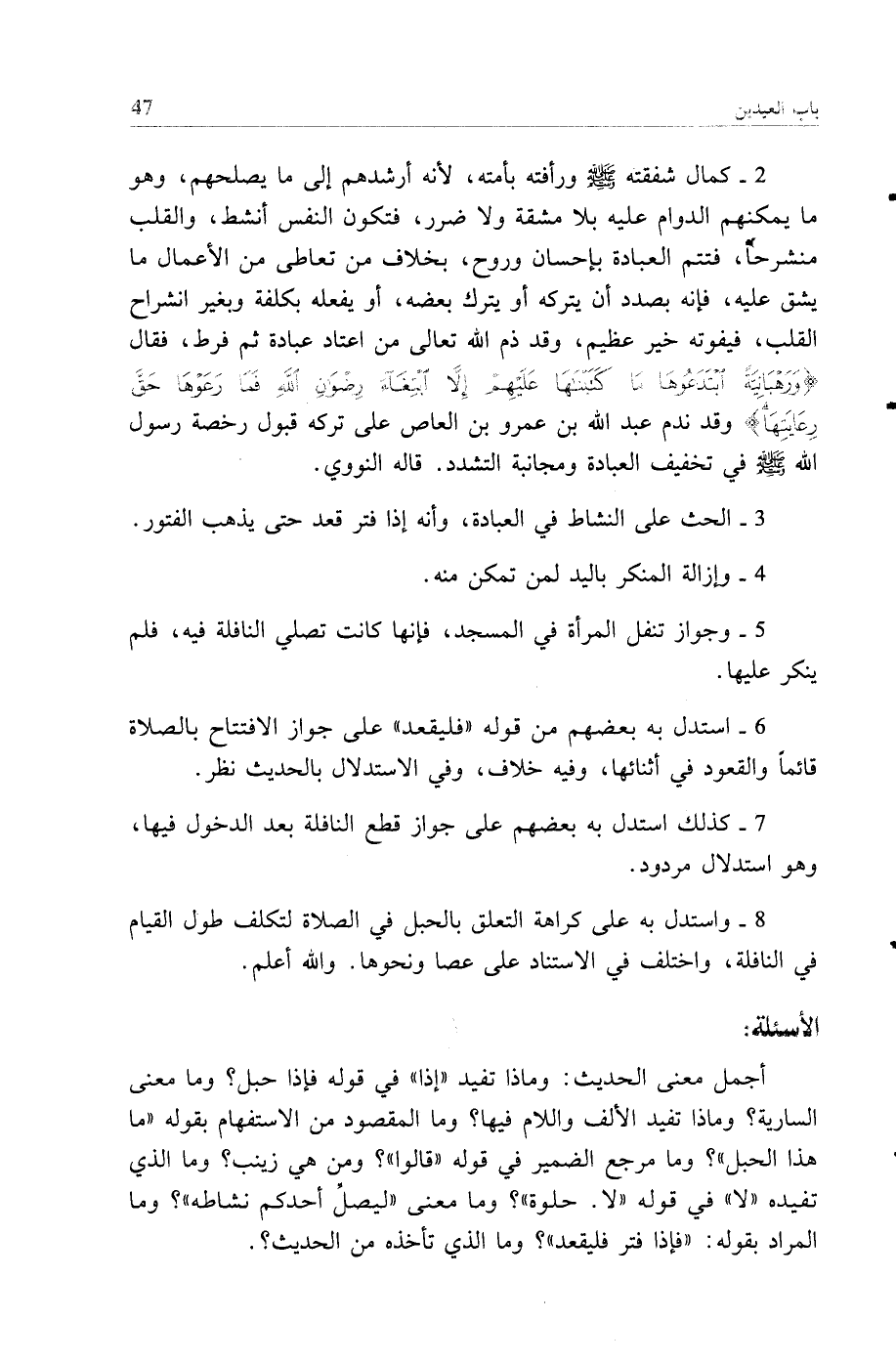 2 - كمال شفقته صلى الله عليه وسلم ورأفته بأمته لأنه أرشدهم إلى ما يصلحهم وهو ما يمكنهم الدوام عليه بلا مشقة ولا ضرر فتكون النفس أنشط والقلب منشرحا فتتم العبادة بإحسان وروح بخلاف من تعاطى من الأعمال ما يشق عليه فإنه بصدد أن يتركه أو يترك بعضه أو يفعله بكلفة وبغير انشراح القلب فيفوته خير عظيم وقد ذم الله تعالى من اعتاد عبادة ثم فرط فقال: {وَرَهْبَانِيَّةً ابْتَدَعُوهَا مَا كَتَبْنَاهَا عَلَيْهِمْ إِلَّا ابْتِغَاء رِضْوَانِ اللَّهِ فَمَا رَعَوْهَا حَقَّ رِعَايَتِهَا} وقد ندم عبد الله بن عمرو بن العاص على تركه قبول رخصة رسول الله صلى الله عليه وسلم في تخفيف العبادة ومجانبة التشدد قاله النووي