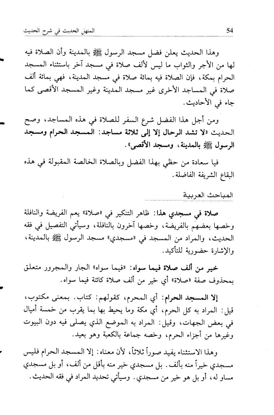 وهذا الاستثناء يفيد صورا ثلاثا لأن معناه إلا المسجد الحرام فليس مسجدي خيرا منه بألف بل مسجدي خير منه بأقل من ألف أو بل مسجدي مساو له أو بل هو خير من مسجدي وسيأتي تحديد المراد في فقه الحديث