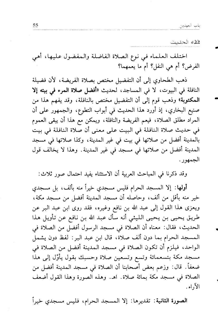 ذهب الطحاوي إلى أن التفضيل مختص بصلاة الفريضة لأن فضيلة النافلة في البيوت لا في المساجد لحديث "أفضل صلاة المرء في بيته إلا المكتوبة" وذهب قوم إلى أن التفضيل مختص بالنافلة وقد يفهم هذا من صنيع البخاري إذ أورد هذا الحديث في أبواب التطوع والجمهور على أن المراد مطلق الصلاة فيعم الفريضة والنافلة ويمكن مع هذا أن يبقى العموم في حديث صلاة النافلة في البيت على معنى أن صلاة النافلة في بيت بالمدينة أفضل من صلاتها في بيت في غير المدينة وكذا صلاتها في مسجد المدينة أفضل من صلاتها في مسجد في غير المدينة وهذا لا يخالف قول الجمهور