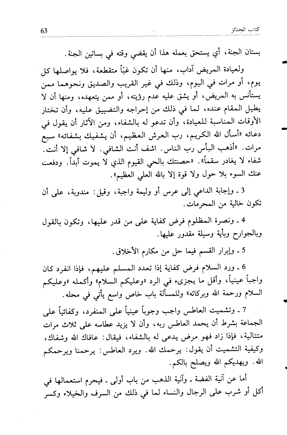 6 - ورد السلام فرض كفاية إذا تعدد المسلم عليهم فإذا انفرد كان واجبا عينيا وأقل ما يجزئ في الرد "وعليكم السلام" وأكمله "وعليكم السلام ورحمة الله وبركاته" وللمسألة باب خاص واسع يأتي في محله
