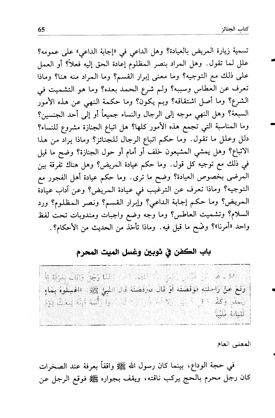 14 - عن ابن عباس رضي الله عنهما قال: بينما رجل واقف بعرفة إذ وقع عن راحلته فوقصته أو قال فأوقصته قال النبي صلى الله عليه وسلم "اغسلوه بماء وسدر وكفنوه في ثوبين ولا تحنطوه ولا تخمروا رأسه فإنه يبعث يوم القيامة ملبيا"
