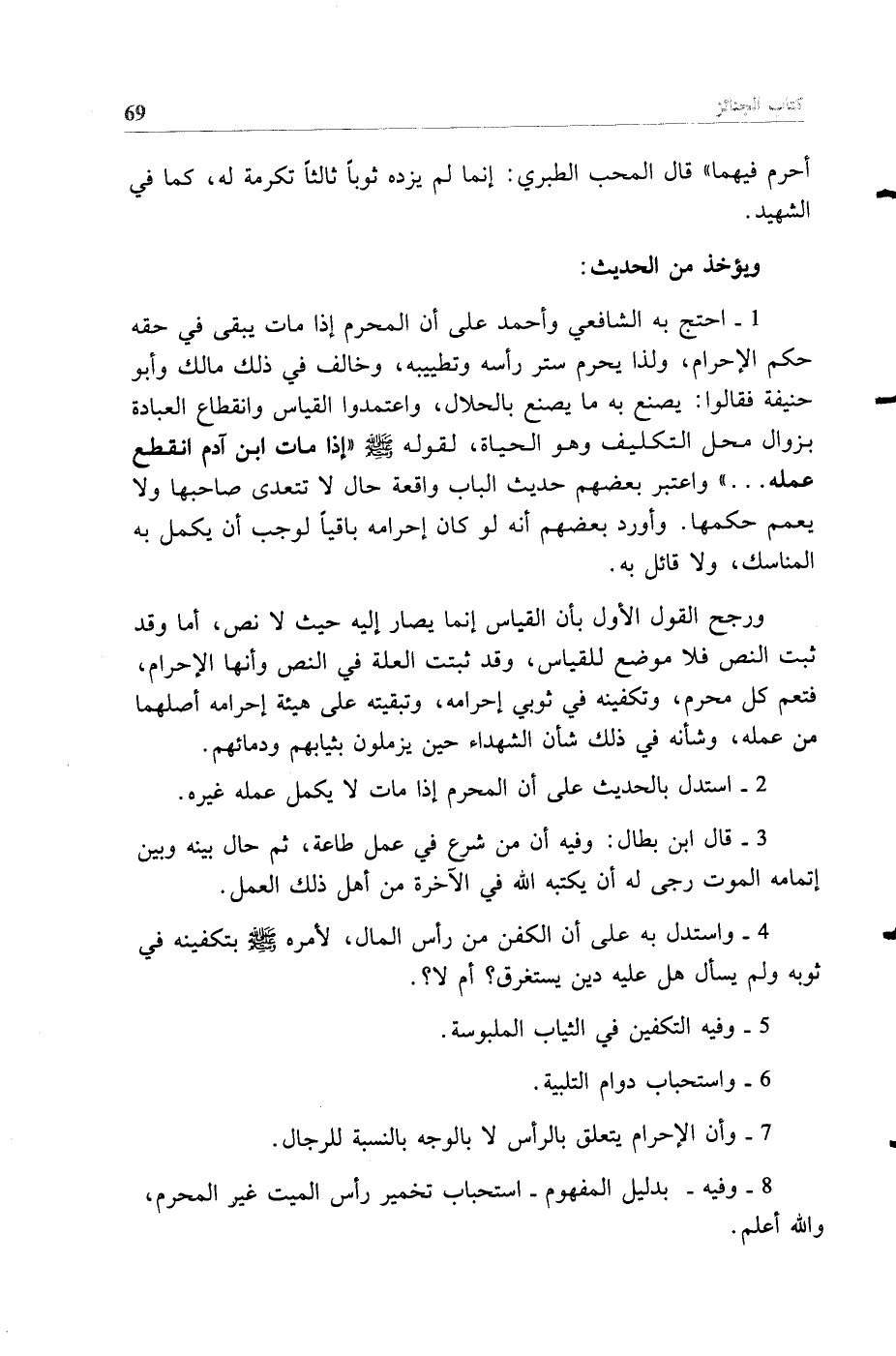 ورجح القول الأول بأن القياس إنما يصار إليه حيث لا نص أما وقد ثبت النص فلا موضع للقياس وقد ثبتت العلة في النص وأنها الإحرام فتعم كل محرم وتكفينه في ثوبي إحرامه وتبقيته على هيئة إحرامه أصلهما من عمله وشأنه في ذلك شأن الشهداء حين يزملون بثيابهم ودمائهم