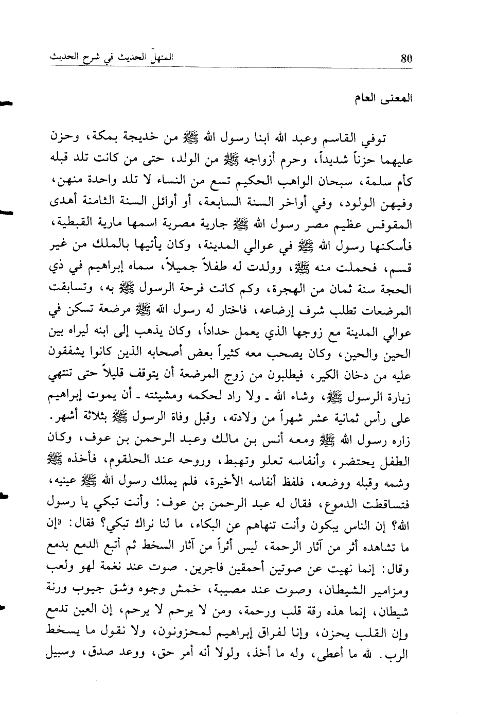 توفي القاسم وعبد الله ابنا رسول الله صلى الله عليه وسلم من خديجة بمكة وحزن عليهما حزنا شديدا وحرم أزواجه صلى الله عليه وسلم من الولد حتى من كانت تلد قبله كأم سلمة سبحان الواهب الحكيم تسع من النساء لا تلد واحدة منهن وفيهن الولود وفي أواخر السنة السابعة أو أوائل السنة الثامنة أهدى المقوقس عظيم مصر رسول الله صلى الله عليه وسلم جارية مصرية اسمها مارية القبطية فأسكنها رسول الله صلى الله عليه وسلم في عوالي المدينة وكان يأتيها بالملك من غير قسم فحملت منه صلى الله عليه وسلم وولدت له طفلا جميلا سماه إبراهيم في ذي الحجة سنة ثمان من الهجرة وكم كانت فرحة الرسول صلى الله عليه وسلم به وتسابقت المرضعات تطلب شرف إرضاعه فاختار له رسول الله صلى الله عليه وسلم مرضعة تسكن في عوالي المدينة مع زوجها الذي يعمل حدادا وكان يذهب إلى ابنه ليراه بين الحين والحين وكان يصحب معه كثيرا بعض أصحابه الذين كانوا يشفقون عليه من دخان الكير فيطلبون من زوج المرضعة أن يتوقف قليلا حتى تنتهي زيارة الرسول صلى الله عليه وسلم وشاء الله -ولا راد لحكمه ومشيئته -أن يموت إبراهيم على رأس ثمانية عشر شهرا من ولادته وقبل وفاة الرسول صلى الله عليه وسلم بثلاثة أشهر زاره رسول الله صلى الله عليه وسلم ومعه أنس بن مالك وعبد الرحمن بن عوف وكان الطفل يحتضر وأنفاسه تعلو وتهبط وروحه عند الحلقوم فأخذه صلى الله عليه وسلم وشمه وقبله ووضعه فلفظ أنفاسه الأخيرة فلم يملك رسول الله صلى الله عليه وسلم عينيه فتساقطت الدموع فقال له عبد الرحمن بن عوف وأنت تبكي يا رسول الله إن الناس يبكون وأنت تنهاهم عن البكاء ما لنا نراك تبكي؟ فقال إن ما تشاهده أثر من آثار الرحمة ليس أثرا من آثار السخط ثم أتبع الدمع بدمع وقال إنما نهيت عن صوتين أحمقين فاجرين صوت عند نغمة لهو ولعب ومزامير الشيطان وصوت عند مصيبة خمش وجوه وشق جيوب ورنة شيطان إنما هذه رقة قلب ورحمة