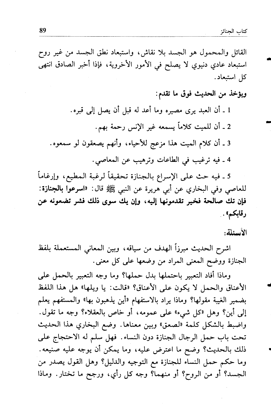 5 - فيه حث على الإسراع بالجنازة تحقيقا لرغبة المطيع وإرغاما للعاصي وفي البخاري عن أبي هريرة عن النبي صلى الله عليه وسلم قال: "اسرعوا بالجنازة فإن تك صالحة فخير تقدمونها إليه وإن يك سوى ذلك فشر تضعونه عن رقابكم