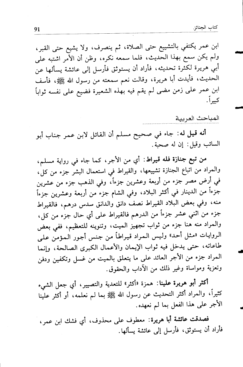 ابن عمر يكتفي بالتشييع حتى الصلاة ثم ينصرف ولا يشيع حتى القبر ولم يكن سمع بهذا الحديث فلما سمعه نكره وظن أن الأمر اشتبه على أبي هريرة لكثرة تحديثه فأراد أن يستوثق فأرسل إلى عائشة يسألها عن الحديث فأيدت أبا هريرة وقالت نعم سمعته من رسول الله صلى الله عليه وسلم فأسف ابن عمر على زمن مضى لم يقم فيه بهذه الشعيرة فضيع على نفسه ثوابا كبيرا