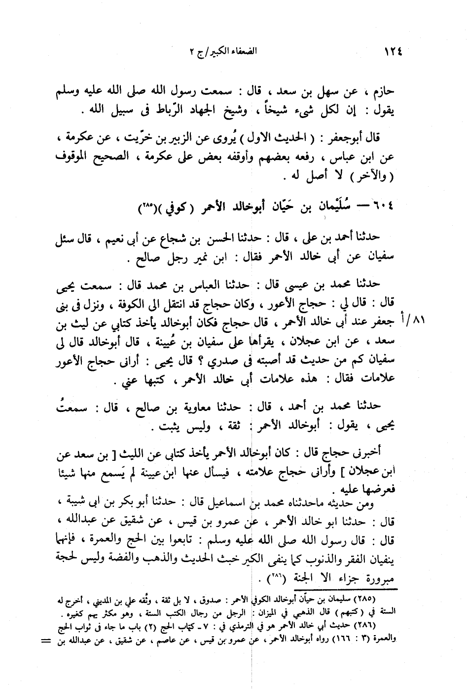 §604 - سُلَيْمَانُ بْنُ حَيَّانَ أَبُو خَالِدٍ الْأَحْمَرُ كُوفِيٌّ حَدَّثَنَا أَحْمَدُ بْنُ عَلِيٍّ قَالَ: حَدَّثَنَا الْحَسَنُ بْنُ شُجَاعٍ، عَنْ أَبِي نُعَيْمٍ قَالَ: سُئِلَ سُفْيَانُ عَنْ أَبِي خَالِدٍ الْأَحْمَرِ، فَقَالَ: ابْنُ نُمَيْرٍ رَجُلٌ صَالِحٌ. حَدَّثَنَا مُحَمَّدُ بْنُ عِيسَى قَالَ: حَدَّثَنَا الْعَبَّاسُ بْنُ مُحَمَّدٍ قَالَ: سَمِعْتُ يَحْيَى قَالَ: قَالَ لِي حَجَّاجٌ الْأَعْوَرُ: كَانَ حَجَّاجٌ قَدِ انْتَقَلَ إِلَى الْكُوفَةِ فَنَزَلَ فِي بَنِي جَعْفَرٍ عِنْدَ أَبِي خَالِدٍ الْأَحْمَرِ، قَالَ حَجَّاجٌ: فَكَانَ أَبُو خَالِدٍ يَأْخُذُ كِتَابِي عَنْ لَيْثِ بْنِ سَعْدٍ، عَنِ ابْنِ عَجْلَانَ يَقْرَأُهَا عَلَى سُفْيَانَ بْنِ عُيَيْنَةَ، قَالَ أَبُو خَالِدٍ: قَالَ لِي سُفْيَانُ: كَمْ مِنْ حَدِيثٍ قَدْ أَصَبْتَهُ فِي صَدْرِي؟ قَالَ يَحْيَى: أَرَانِي حَجَّاجٌ الْأَعْوَرُ عَلَامَاتٍ، فَقَالَ: هَذِهِ عَلَامَاتُ أَبِي خَالِدٍ الْأَحْمَرِ كَتَبَهَا عَنِّي. حَدَّثَنَا مُحَمَّدُ بْنُ أَحْمَدَ قَالَ: حَدَّثَنَا مُعَاوِيَةُ بْنُ صَالِحٍ قَالَ: سَمِعْتُ يَحْيَى يَقُولُ: أَبُو خَالِدٍ الْأَحْمَرُ ثِقَةٌ وَلَيْسَ يَثْبُتُ. أَخْبَرَنِي حَجَّاجٌ قَالَ: كَانَ أَبُو خَالِدٍ الْأَحْمَرُ يَأْخُذُ كِتَابِي عَنِ اللَّيْثِ، عَنِ ابْنِ عَجْلَانَ، وَأَرَانِي حَجَّاجٌ عَلَامَاتِهِ، فَيَسْأَلُ عَنْهَا ابْنَ عُيَيْنَةَ لَمْ نَسْمَعْ مِنْهَا شَيْئًا يَعْرِضُهَا عَلَيْهِ