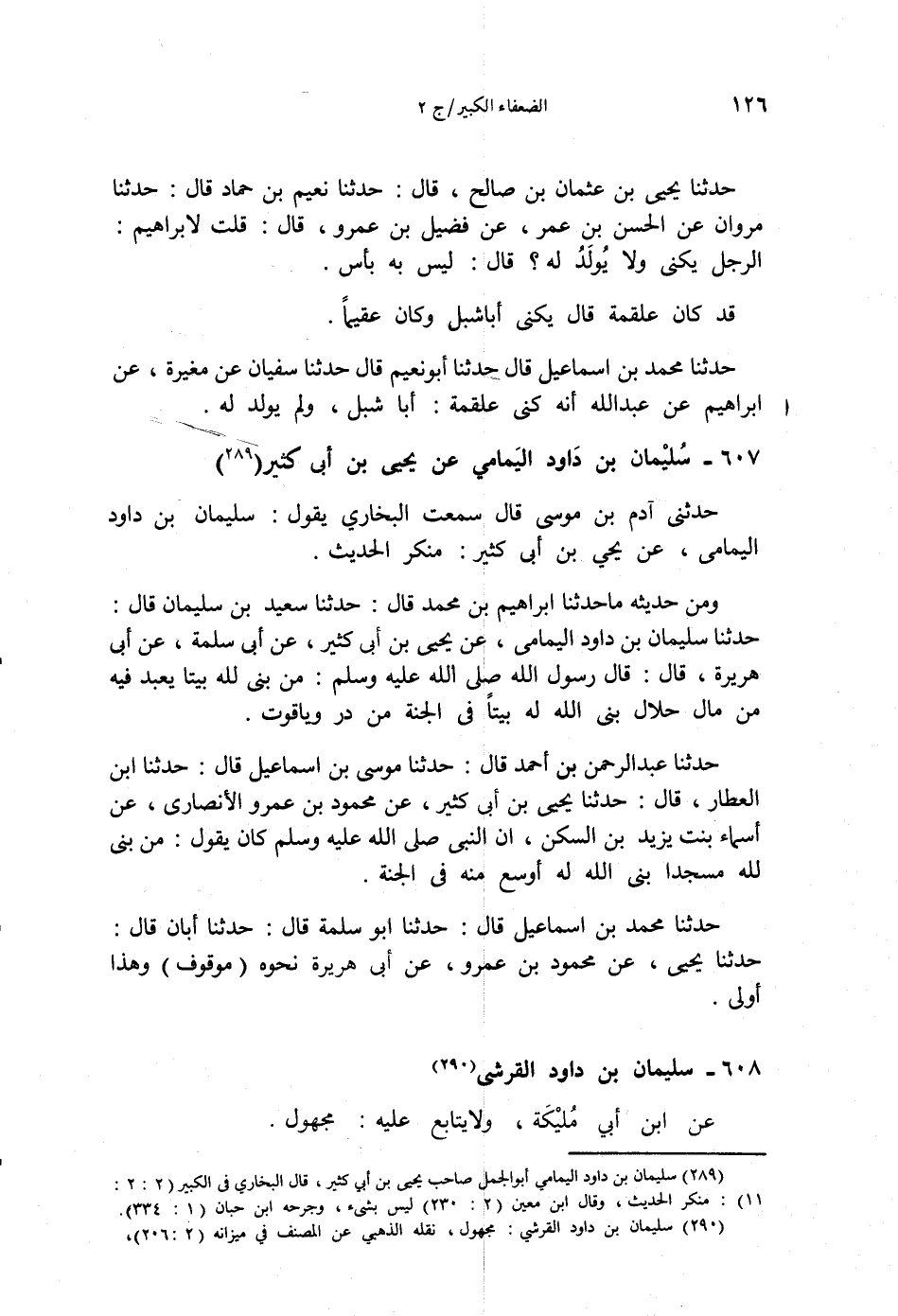 §607 - سُلَيْمَانُ بْنُ دَاوُدَ الْيَمَامِيُّ عَنْ يَحْيَى بْنِ أَبِي كَثِيرٍ. حَدَّثَنِي آدَمُ بْنُ مُوسَى قَالَ: سَمِعْتُ الْبُخَارِيَّ يَقُولُ: سُلَيْمَانُ بْنُ دَاوُدَ الْيَمَامِيُّ، عَنْ يَحْيَى بْنِ أَبِي كَثِيرٍ، مُنْكَرُ الْحَدِيثِ