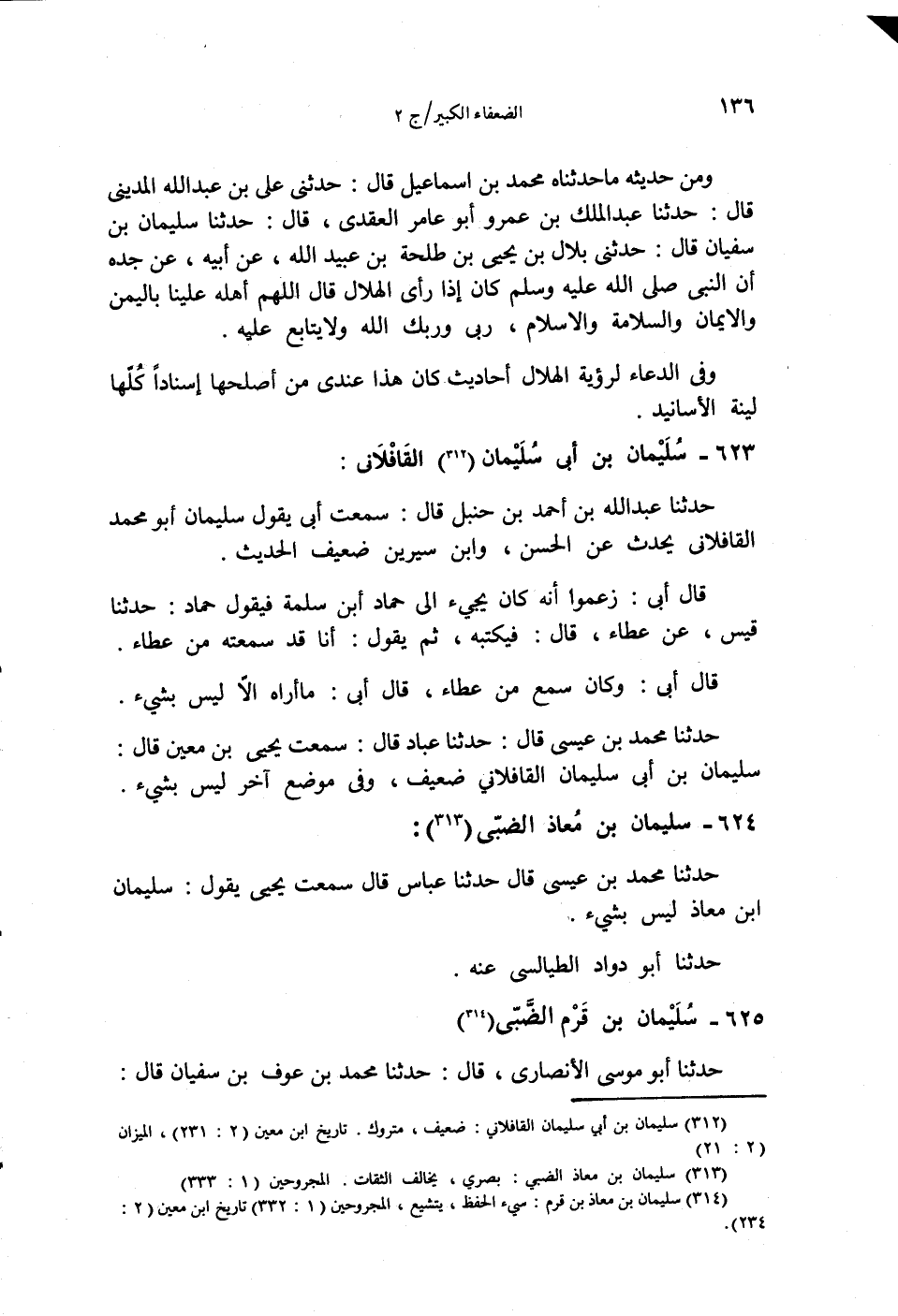 §624 - سُلَيْمَانُ بْنُ مُعَاذٍ الضَّبِّيُّ حَدَّثَنَا مُحَمَّدُ بْنُ عِيسَى قَالَ: حَدَّثَنَا عَبَّاسٌ قَالَ: سَمِعْتُ يَحْيَى يَقُولُ: سُلَيْمَانُ بْنُ مُعَاذٍ لَيْسَ بِشَيْءٍ، حَدَّثَنَا أَبُو دَاوُدَ الطَّيَالِسِيُّ عَنْهُ