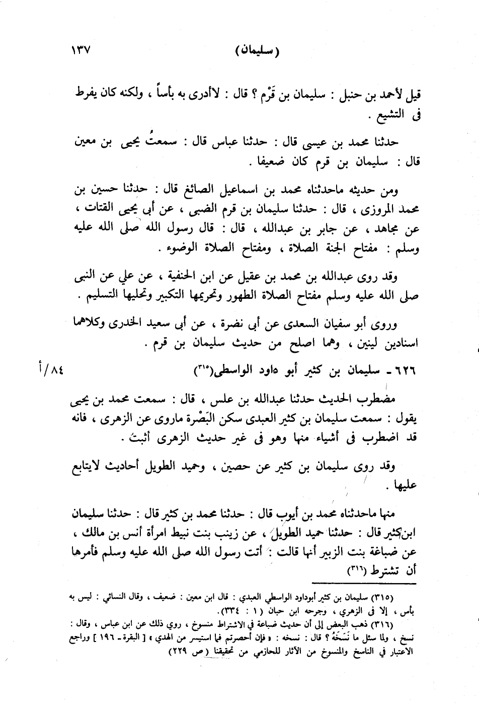 §626 - سُلَيْمَانُ بْنُ كَثِيرٍ أَبُو دَاوُدَ الْوَاسِطِيُّ مُضْطَرِبُ الْحَدِيثِ. حَدَّثَنَا عَبْدُ اللَّهِ بْنُ عَلِيٍّ قَالَ: سَمِعْتُ مُحَمَّدَ بْنَ يَحْيَى، يَقُولُ: سَمِعْتُ سُلَيْمَانَ بْنَ كَثِيرٍ الْعَبْدِيَّ، سَكَنَ الْبَصْرَةَ، مَا رَوَى عَنِ الزُّهْرِيِّ، فَإِنَّهُ قَدِ اضْطَرَبَ فِي أَشْيَاءَ مِنْهَا، وَهُوَ فِي غَيْرِ حَدِيثِ الزُّهْرِيِّ أَثْبَتُ، وَقَدْ رَوَى سُلَيْمَانُ بْنُ كَثِيرٍ عَنْ حُصَيْنٍ وَحُمَيْدٍ الطَّوِيلِ أَحَادِيثَ لَا يُتَابَعُ عَلَيْهَا