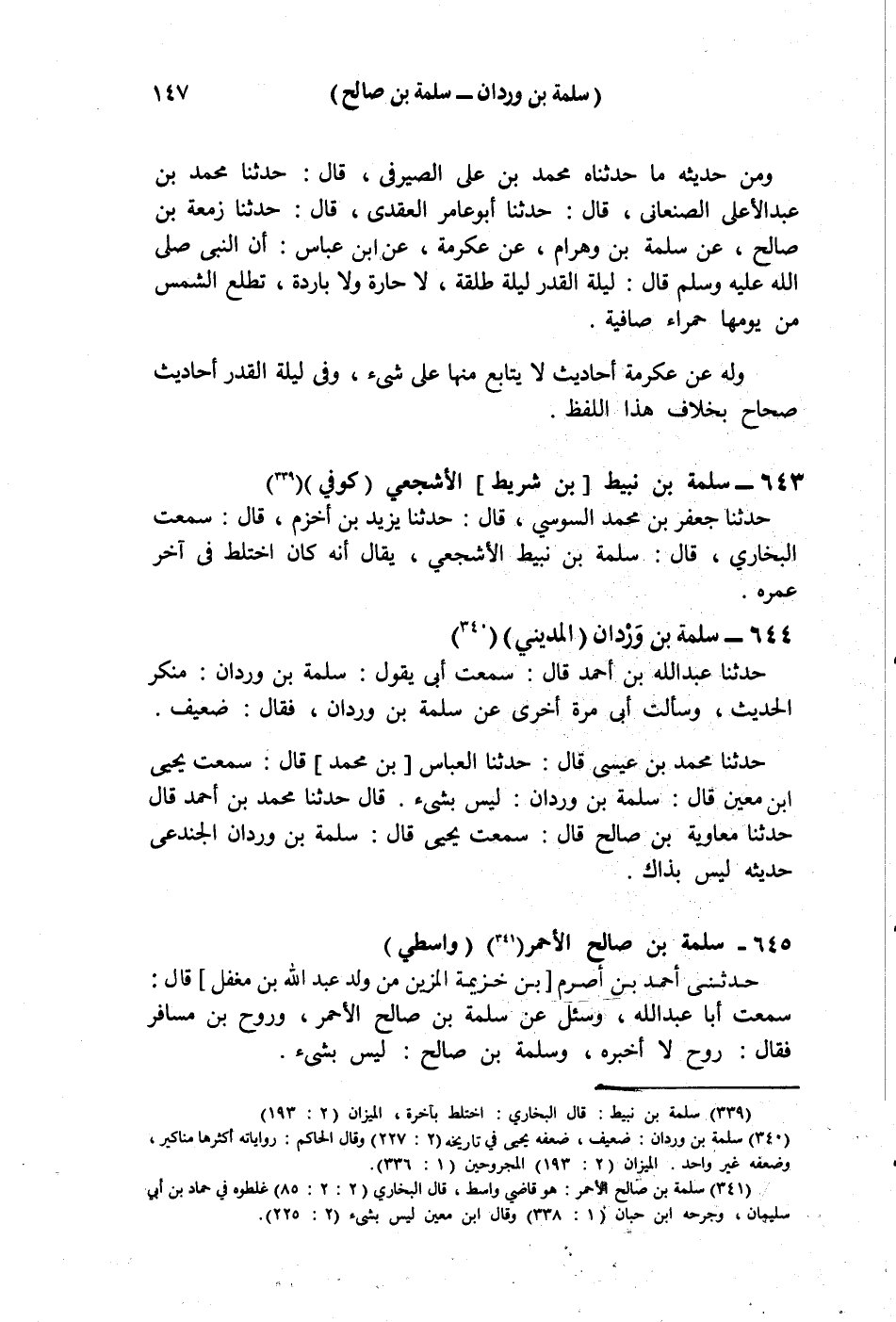 §643 - سَلَمَةُ بْنُ نُبَيْطٍ الْأَشْجَعِيُّ، كُوفِيٌّ حَدَّثَنَا جَعْفَرُ بْنُ مُحَمَّدِ السُّوسِيُّ قَالَ: حَدَّثَنَا زَيْدُ بْنُ أَخْزَمَ قَالَ: سَمِعْتُ عَبْدَ اللَّهِ بْنَ دَاوُدَ يَقُولُ: رَأَيْتُ سَلَمَةَ بْنَ نُبَيْطٍ وَمَا يَبْكِي، ثُمَّ رَأَيْتُهُ يَبْكِي. حَدَّثَنِي آدَمُ بْنُ مُوسَى قَالَ: سَمِعْتُ الْبُخَارِيَّ قَالَ: سَلَمَةُ بْنُ نُبَيْطٍ الْأَشْجَعِيُّ يُقَالُ أَنَّهُ كَانَ اخْتَلَطَ فِي آخِرِ عُمُرِهِ