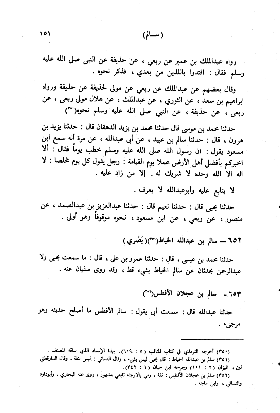 §652 - سَالِمُ بْنُ عَبْدِ اللَّهِ الْخَيَّاطُ، بَصْرِيٌّ حَدَّثَنَا مُحَمَّدُ بْنُ عِيسَى قَالَ: حَدَّثَنَا عَمْرُو بْنُ عَلِيٍّ قَالَ: مَا سَمِعْتُ يَحْيَى وَلَا عَبْدَ الرَّحْمَنِ يُحَدِّثَانِ عَنْ سَالِمٍ الْخَيَّاطِ بِشَيْءٍ قَطُّ، وَقَدْ رَوَى سُفْيَانُ عَنْهُ