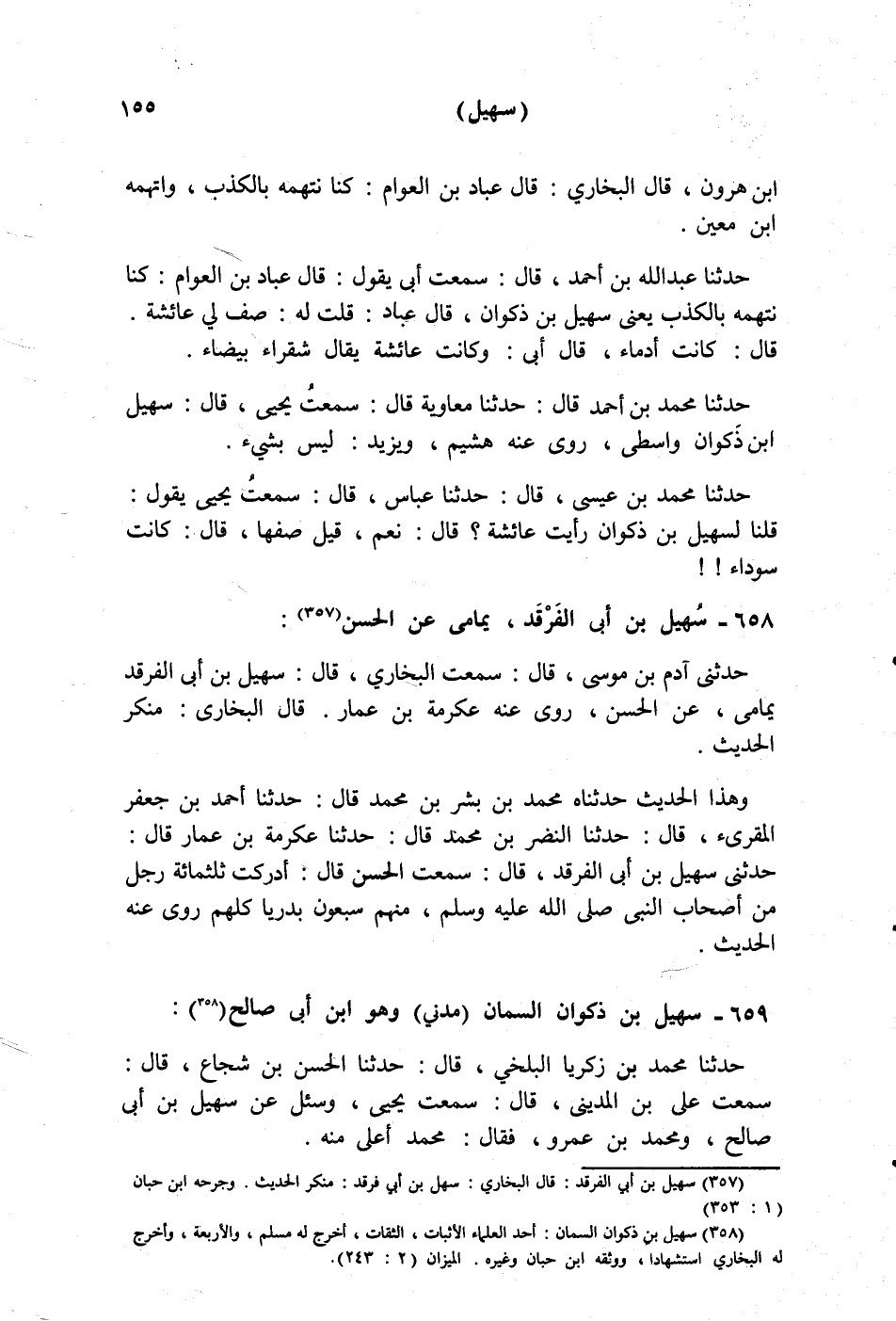§659 - سُهَيْلُ بْنُ ذَكْوَانَ السَّمَّانُ مَدَنِيٌّ وَهُوَ ابْنُ أَبِي صَالِحٍ. حَدَّثَنَا مُحَمَّدُ بْنُ زَكَرِيَّا الْبَلْخِيُّ قَالَ: حَدَّثَنَا الْحَسَنُ بْنُ شُجَاعٍ قَالَ: سَمِعْتُ عَلِيَّ بْنَ الْمَدِينِيِّ قَالَ: سَمِعْتُ يَحْيَى، وَسُئِلَ عَنْ سُهَيْلِ بْنِ أَبِي صَالِحٍ، وَمُحَمَّدِ بْنِ عَمْرٍو، فَقَالَ: مُحَمَّدُ أَعْلَى مِنْهُ. حَدَّثَنَا مُحَمَّدُ بْنُ عِيسَى قَالَ: حَدَّثَنَا عَبَّاسٌ قَالَ: سُئِلَ يَحْيَى عَنْ حَدِيثِ سُهَيْلٍ وَالْعَلَاءِ قَالَ: حَدِيثُهُمَا قَرِيبٌ مِنَ السَّوَاءِ، وَلَيْسَ حَدِيثُهُمَا بِالْحُجَّةِ، وَسَمِعْتُ يَحْيَى يَقُولُ: سُهَيْلُ بْنُ أَبِي صَالِحٍ صُوَيْلِحٌ، وَفِيهِ لِينٌ، مَاتَ سَنَةَ أَرْبَعِينَ وَمِائَةٍ، وَسَمِعْتُ يَحْيَى فِي مَوْضِعٍ آخَرَ يَقُولُ: الْعَلَاءُ وَسُهَيْلٌ حَدِيثُهُمْ قَرِيبٌ عَنِ السَّوَاءِ، وَلَيْسَ حَدِيثُهُمْ بِالْحُجَّةِ، أَوْ قَرِيبًا مِنْ هَذَا، وَمُحَمَّدُ بْنُ عَمْرٍو أَكْثَرُ مِنْ هَؤُلَاءِ الْأَرْبَعَةِ، يَعْنِي مِنْ سُهَيْلٍ وَالْعَلَاءِ وَعَاصِمِ بْنِ عَبْدِ اللَّهِ وَابْنِ عَقِيلٍ. بِسْمِ اللَّهِ الرَّحْمَنِ الرَّحِيمِ وَصَلَّى اللَّهُ عَلَى مُحَمَّدٍ وَآَلِهِ وَسَلَّمَ أَخْبَرَنَا أَبُو عَبْدِ اللَّهِ الْبُجَلِّي قَالَ أَخْبَرَنَا أَبُو جَعْفَرٍ الْعُقَيْلِيُّ حَدَّثَنَا مُحَمَّدُ بْنُ عِيسَى قَالَ: حَدَّثَنَا مُحَمَّدُ بْنُ عَلِيٍّ الْوَرَّاقُ قَالَ: سَمِعْتُ أَحْمَدَ بْنَ حَنْبَلٍ، سُئِلَ فَقِيلَ لَهُ: سُهَيْلُ بْنُ أَبِي صَالِحٍ كَيْفَ حَدِيثُهُ؟ فَقَالَ: صَالِحٌ، قِيلَ إِنَّ يَحْيَى الْقَطَّانَ يُقَدِّمُ مُحَمَّدَ بْنَ عَمْرٍو عَلَى سُهَيْلٍ، فَقَالَ: لَمْ يَكُنْ لَهُ بِسُهَيْلٍ عِلْمٌ، وَقَدْ كَانَ جَالَسَ مُحَمَّدَ بْنَ عَمْرٍو