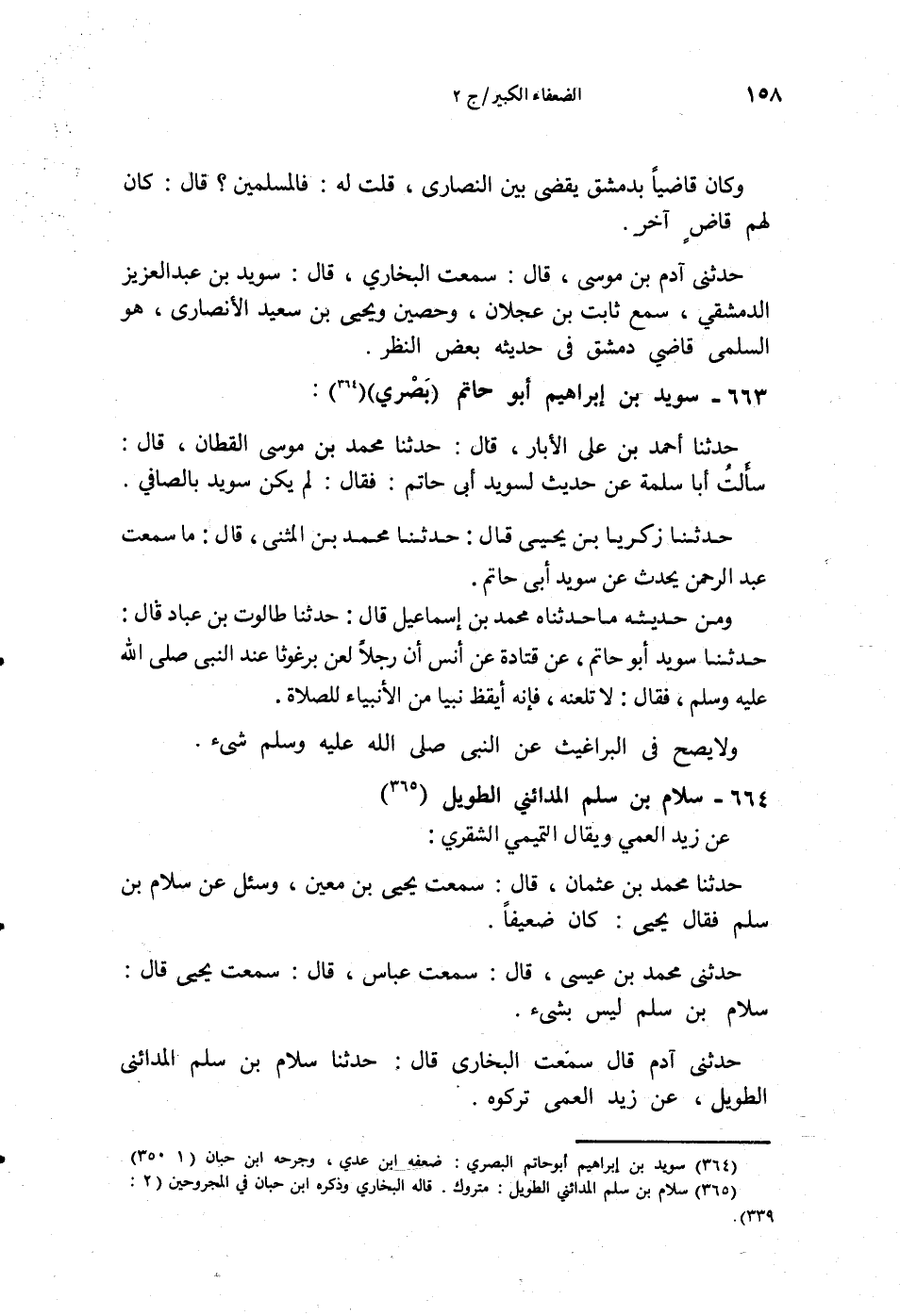 §664 - سَلَّامُ بْنُ سَلْمٍ الْمَدَائِنِيُّ الطَّوِيلُ عَنْ زَيْدٍ الْعَمِّيِّ، وَيُقَالُ التَّمِيمِيُّ الشَّقَرِيُّ. حَدَّثَنَا مُحَمَّدُ بْنُ عُثْمَانَ قَالَ: سَمِعْتُ يَحْيَى بْنَ مَعِينٍ، وَسُئِلَ عَنْ سَلَّامِ بْنِ سَلْمٍ، فَقَالَ يَحْيَى: كَانَ ضَعِيفًا. حَدَّثَنِي مُحَمَّدُ بْنُ عِيسَى قَالَ: سَمِعْتُ عَبَّاسًا قَالَ: سَمِعْتُ يَحْيَى قَالَ: سَلَّامُ بْنُ سَلْمٍ لَيْسَ بِشَيْءٍ. حَدَّثَنِي آدَمُ قَالَ: سَمِعْتُ الْبُخَارِيَّ قَالَ: حَدَّثَنَا سَلَّامُ بْنُ سَلْمٍ الْمَدَائِنِيُّ الطَّوِيلُ، عَنْ زَيْدٍ الْعَمِّيِّ، تَرَكُوهُ. حَدَّثَنَا أَحْمَدُ بْنُ مَحْمُودٍ قَالَ: سَمِعْتُ الْأَعْيَنَ قَالَ: سَمِعْتُ أَبَا نُعَيْمٍ ضَعَّفَ سَلَّامَ بْنَ سَلْمٍ