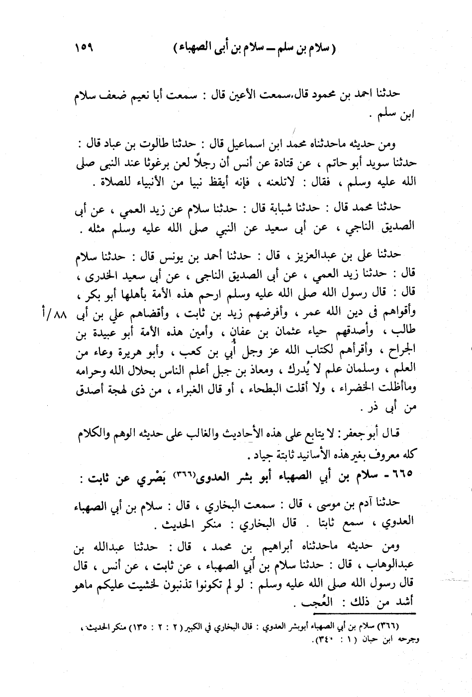 §665 - سَلَّامُ بْنُ أَبِي الصَّهْبَاءِ أَبُو بِشْرٍ الْعَدَوِيُّ، بَصْرِيٌّ عَنْ ثَابِتٍ. حَدَّثَنِي آدَمُ بْنُ مُوسَى قَالَ: سَمِعْتُ الْبُخَارِيَّ قَالَ: سَلَّامُ بْنُ أَبِي الصَّهْبَاءِ الْعَدَوِيُّ سَمِعَ ثَابِتًا، قَالَ الْبُخَارِيُّ: مُنْكَرُ الْحَدِيثِ