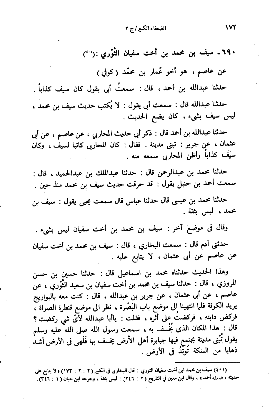 §690 - سَيْفُ بْنُ مُحَمَّدٍ ابْنُ أُخْتِ الثَّوْرِيِّ عَنْ عَاصِمٍ، هُوَ أَخُو عَمَّارِ بْنِ مُحَمَّدٍ، كُوفِيٌّ. حَدَّثَنَا عَبْدُ اللَّهِ بْنُ أَحْمَدَ قَالَ: سَمِعْتُ أَبِي يَقُولُ: كَانَ سَيْفٌ كَذَّابًا. حَدَّثَنَا عَبْدُ اللَّهِ قَالَ: سَمِعْتُ أَبِي يَقُولُ: لَا يُكْتَبُ حَدِيثُ سَيْفِ بْنِ مُحَمَّدٍ، لَيْسَ سَيْفٌ بِشَيْءٍ، كَانَ يَضَعُ الْحَدِيثَ. حَدَّثَنَا عَبْدُ اللَّهِ بْنُ أَحْمَدَ قَالَ: ذَكَرَ أَبِي حَدِيثَ الْمُحَارِبِيِّ، عَنْ عَاصِمٍ، عَنْ أَبِي عُثْمَانَ، عَنْ جَرِيرٍ: تُبْنَى مَدِينَةٌ، فَقَالَ: كَانَ الْمُحَارِبِيُّ كَاتِبًا لِسَيْفٍ، وَكَانَ سَيْفٌ كَذَّابًا، وَأَظُنُّ الْمُحَارِبِيَّ سَمِعَهُ مِنْهُ. حَدَّثَنَا مُحَمَّدُ بْنُ عَبْدِ الرَّحْمَنِ قَالَ: حَدَّثَنَا عَبْدُ الْمَلِكِ بْنُ عَبْدِ الْحَمِيدِ قَالَ: سَمِعْتُ أَحْمَدَ بْنَ حَنْبَلٍ يَقُولُ: قَدْ خَرَقْتُ حَدِيثَ سَيْفِ بْنِ مُحَمَّدٍ مُنْذُ حِينٍ. حَدَّثَنَا مُحَمَّدُ بْنُ عِيسَى قَالَ: حَدَّثَنَا عَبَّاسٌ قَالَ: سَمِعْتُ يَحْيَى يَقُولُ: سَيْفُ بْنُ مُحَمَّدٍ لَيْسَ بِثِقَةٍ، وَقَالَ فِي مَوْضِعٍ آخَرَ: سَيْفُ بْنُ مُحَمَّدٍ ابْنُ أُخْتِ سُفْيَانَ لَيْسَ بِشَيْءٍ. . حَدَّثَنِي أَحْمَدُ بْنُ مَحْمُودٍ قَالَ حَدَّثَنَا عُثْمَانُ بْنُ سَعِيدٍ قَالَ: قَالَ لِي يَحْيَي بْنُ مَعِينٍ سَيْفُ بْنُ مُحَمَّدٍ ابْنِ أُخْتِ سُفْيَانَ كَذَّابٌ خَبِيثٌ حَدَّثَنِي آدَمُ قَالَ: سَمِعْتُ الْبُخَارِيَّ قَالَ: سَيْفُ بْنُ مُحَمَّدٍ ابْنُ أُخْتِ سُفْيَانَ، عَنْ عَاصِمٍ، عَنْ أَبِي عُثْمَانَ، لَا يُتَابَعُ عَلَيْهِ