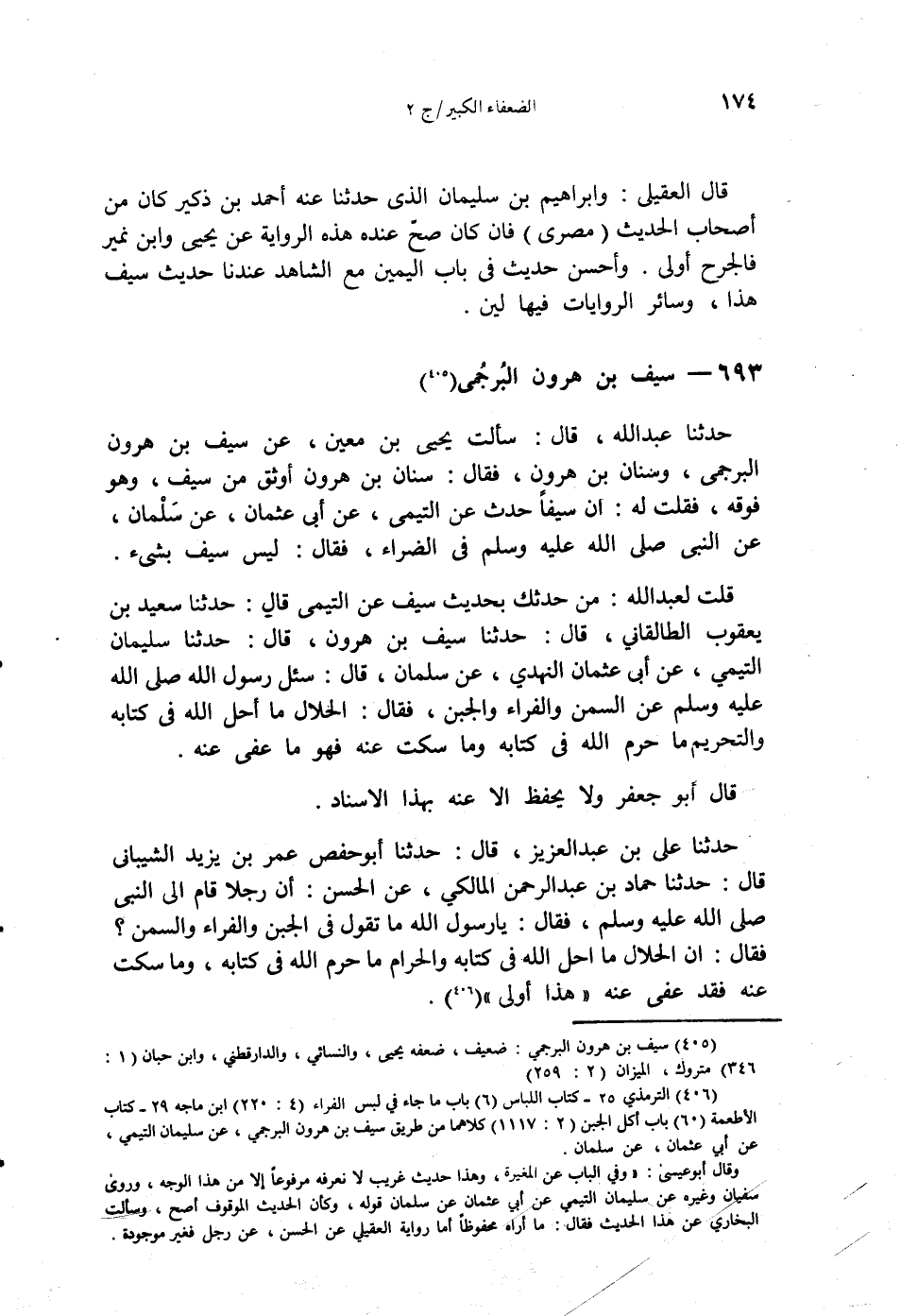 §693 - سَيْفُ بْنُ هَارُونَ الْبُرْجُمِيُّ حَدَّثَنَا عَبْدُ اللَّهِ قَالَ: سَأَلْتُ يَحْيَى بْنَ مَعِينٍ عَنْ سَيْفِ بْنِ هَارُونَ الْبُرْجُمِيِّ، وَسِنَانِ بْنِ هَارُونَ، فَقَالَ: سِنَانُ بْنُ هَارُونَ أَوْثَقُ مِنْ سَيْفٍ وَهُوَ فَوْقَهُ، فَقُلْتُ لَهُ: إِنَّ سَيْفًا حَدَّثَ عَنِ التَّيْمِيِّ، عَنْ أَبِي عُثْمَانَ، عَنْ سَلْمَانَ، عَنِ النَّبِيِّ صَلَّى اللهُ عَلَيْهِ وَسَلَّمَ فِي الفَّرَّاءِ، فَقَالَ: لَيْسَ بِشَيْءٍ. قُلْتُ لِعَبْدِ اللَّهِ: مَنْ حَدَّثَكَ بِحَدِيثِ سَيْفٍ عَنِ التَّيْمِيِّ؟