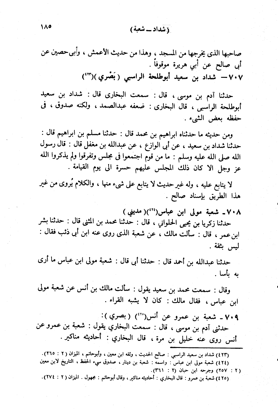 §707 - شَدَّادُ بْنُ سَعِيدٍ أَبُو طَلْحَةَ الرَّاسِبِيُّ، بَصْرِيٌّ حَدَّثَنَا آدَمُ بْنُ مُوسَى قَالَ: سَمِعْتُ الْبُخَارِيَّ قَالَ: شَدَّادُ بْنُ سَعِيدٍ أَبُو طَلْحَةَ الرَّاسِبِيُّ، قَالَ الْبُخَارِيُّ: ضَعَّفَهُ عَبْدُ الصَّمَدِ، وَلَكِنَّهُ صَدُوقٌ، فِي حِفْظِهِ بَعْضُ الشَّيْءِ