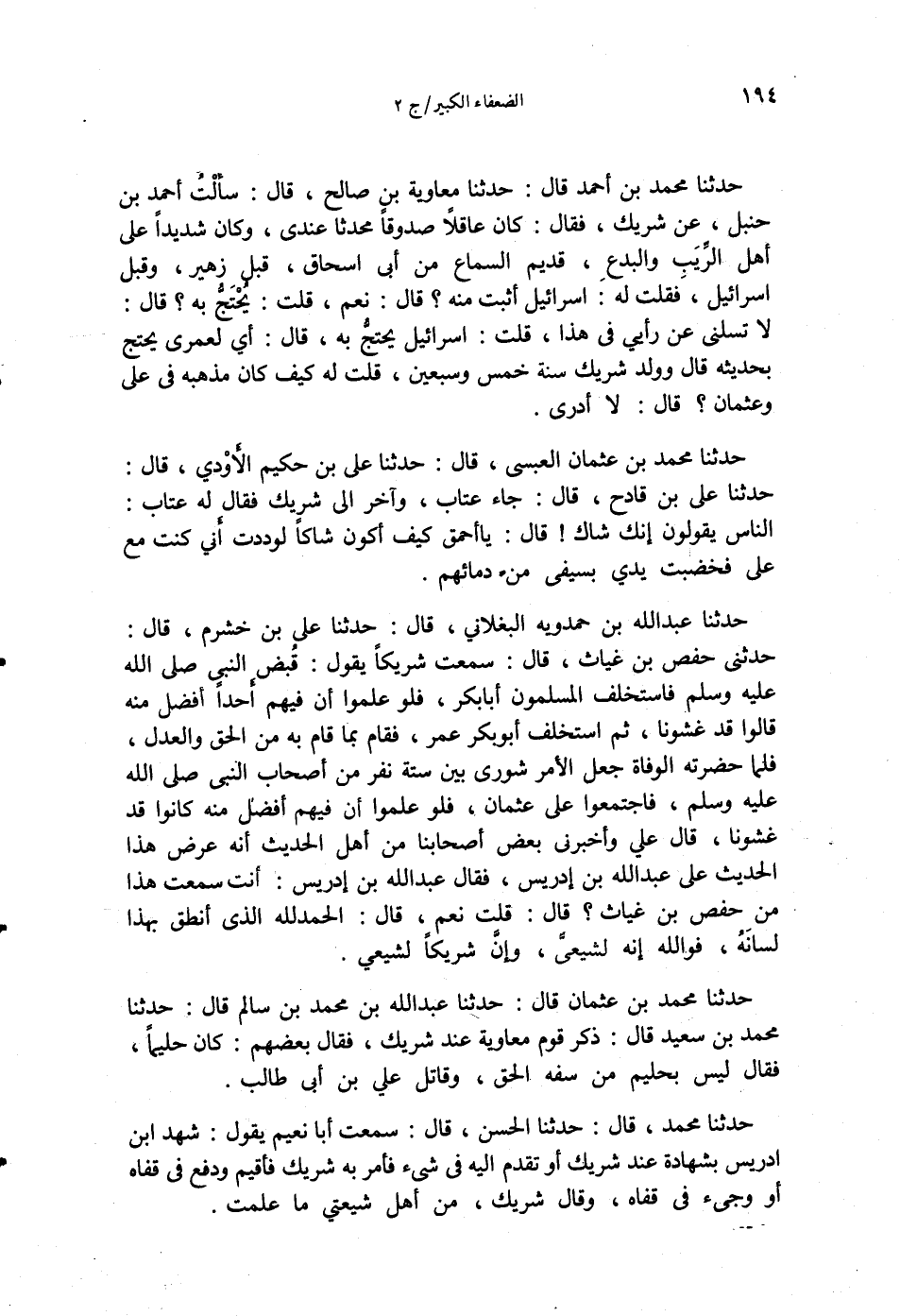 حَدَّثَنَا عَبْدُ اللَّهِ بْنُ حَمْدَوَيْهِ الْبَغْلَانِيُّ قَالَ: حَدَّثَنَا عَلِيُّ بْنُ خَشْرَمٍ قَالَ: حَدَّثَنِي حَفْصُ بْنُ غِيَاثٍ قَالَ: سَمِعْتُ شَرِيكًا، يَقُولُ: §قُبِضَ النَّبِيُّ صَلَّى اللهُ عَلَيْهِ وَسَلَّمَ، فَاسْتَخْلَفَ الْمُسْلِمُونَ أَبَا بَكْرٍ، فَلَوْ عَلِمُوا أَنَّ فِيهِمْ أَحَدًا أَفْضَلَ مِنْهُ كَانُوا قَدْ غَشُّونَا، ثُمَّ اسْتَخْلَفَ أَبُو بَكْرٍ عُمَرَ، فَقَامَ بِمَا قَامَ بِهِ مِنَ الْحَقِّ وَالْعَدْلِ، فَلَمَّا حَضَرَتْهُ الْوَفَاةُ جَعَلَ الْأَمْرَ شُورَى بَيْنَ سِتَّةِ نَفَرٍ مِنْ أَصْحَابِ النَّبِيِّ صَلَّى اللهُ عَلَيْهِ وَسَلَّمَ، فَاجْتَمَعُوا عَلَى عُثْمَانَ، فَلَوْ عَلِمُوا أَنَّ فِيهِمْ أَفْضَلَ مِنْهُ كَانُوا قَدْ غَشُّونَا " قَالَ عَلِيٌّ: وَأَخْبَرَنِي بَعْضُ أَصْحَابِنَا مِنْ أَهْلِ الْحَدِيثِ أَنَّهُ عَرَضَ هَذَا الْحَدِيثَ عَلَى عَبْدِ اللَّهِ بْنِ إِدْرِيسَ، فَقَالَ عَبْدُ اللَّهِ بْنُ إِدْرِيسَ: أَنْتَ سَمِعْتَ هَذَا مِنْ حَفْصِ بْنِ غِيَاثٍ؟ قَالَ: قُلْتُ: نَعَمْ، قَالَ: الْحَمْدُ لِلَّهِ الَّذِي أَنْطَقَ بِهَذَا لِسَانَهُ، فَوَاللَّهِ إِنَّهُ لَشِيعِيٌّ، وَإِنَّ شَرِيكًا لَشِيعِيٌّ حَدَّثَنَا مُحَمَّدُ بْنُ عُثْمَانَ قَالَ: حَدَّثَنَا عَبْدُ اللَّهِ بْنُ مُحَمَّدِ بْنِ سَالِمٍ قَالَ: حَدَّثَنَا مُحَمَّدُ بْنُ سَعِيدٍ قَالَ: ذَكَرَ قَوْمٌ مُعَاوِيَةَ عِنْدَ شَرِيكٍ، فَقَالَ بَعْضُهُمْ: كَانَ حَلِيمًا، فَقَالَ: لَيْسَ بِحَلِيمٍ مَنْ سَفِهَ الْحَقَّ وَقَاتَلَ عَلِيَّ بْنَ أَبِي طَالِبٍ حَدَّثَنَا مُحَمَّدُ بْنُ إِسْمَاعِيلَ الصَّائِغُ قَالَ: حَدَّثَنَا الْحَسَنُ بْنُ عَلِيٍّ قَالَ: سَمِعْتُ أَبَا نُعَيْمٍ يَقُولُ: شَهِدَ ابْنُ إِدْرِيسَ بِشَهَادَةٍ عِنْدَ شَرِيكٍ، أَوْ تَقَدَّمَ إِلَيْهِ فِي شَيْءٍ، فَأَمَرَ بِهِ شَرِيكٌ فَأُقِيمَ وَدُفِعَ فِي قَفَاهُ، أَوْ وَجِيءَ فِي قَفَاهُ، وَقَالَ شَرِيكٌ: مِنْ أَهْلِ بَيْتِ حُمْقٍ مَا عَلِمْتُ حَدَّثَنَا مُحَمَّدٌ قَالَ: حَدَّثَنَا الْحَسَنُ قَالَ: حَدَّثَنَا مُحَمَّدُ بْنُ عِيسَى قَالَ: قُلْتُ لِابْنِ الْمُبَارَكِ - وَهُوَ بِالْكُوفَةِ: أَلَا تَلْقَى شَرِيكًا؟ فَقَالَ: إِنِّي أَكْرَهُ أَنْ أَجْفَاهُ حَدَّثَنَا مُحَمَّدٌ قَالَ: حَدَّثَنَا الْحَسَنُ قَالَ: حَدَّثَنَا يَحْيَى بْنُ أَيُّوبَ قَالَ: كُنَّا عِنْدَ شَرِيكٍ قَالَ: فَظَهَرَ مِنْهُ لِأَصْحَابِ الْحَدِيثِ جَفَاءٌ، انْتَهَرَ بَعْضَهُمْ، فَقَالَ لَهُ الشَّيْخُ إِلَى جَنْبِهِ: يَا أَبَا عَبْدِ اللَّهِ، لَوْ رَفَقْتَ بِهِمْ؟ فَقَالَ لَهُ شَرِيكٌ: النَّبْلُ عَوْنٌ عَلَى الدِّينِ حَدَّثَنَا عَبْدُ اللَّهِ بْنُ أَحْمَدَ قَالَ: سَمِعْتُ أَبِي يَقُولُ: قَدْ كَتَبْتُ عَنْ يَحْيَى بْنِ سَعِيدٍ، عَنْ شَرِيكٍ، عَلَى غَيْرِ وَجْهِ الْحَدِيثِ، يَعْنِي فِي الْمُذَاكَرَةِ حَدَّثَنَا عَبْدُ اللَّهِ بْنُ مُحَمَّدِ بْنِ سَعْدَوَيْهِ قَالَ: حَدَّثَنَا أَحْمَدُ بْنُ عَبْدِ اللَّهِ بْنِ بَشِيرٍ قَالَ: حَدَّثَنَا سُفْيَانُ بْنُ عَبْدِ الْمَلِكِ قَالَ: سَأَلْتُ ابْنَ الْمُبَارَكِ عَنْ حَدِيثِ، زَيْدِ بْنِ ثَابِتٍ أَنَّهُ قَالَ فِي الْبَيْعِ بِالْبَرَاءَةِ: يَبْرَأُ مِنْ كُلِّ عَيْبٍ، فَقَالَ: جَاءَ بِهِ شَرِيكُ بْنُ عَبْدِ اللَّهِ عَلَى غَيْرِ مَا كَانَ فِي كِتَابِهِ، وَلَمْ نَجِدْ لِهَذَا الْحَدِيثِ أَصْلًا حَدَّثَنَا مُحَمَّدُ بْنُ إِسْمَاعِيلَ قَالَ: حَدَّثَنَا الْحَسَنُ بْنُ عَلِيٍّ قَالَ: حَدَّثَنَا مُحَمَّدُ بْنُ عِيسَى قَالَ: شَهِدَ أَبُو بَكْرِ بْنُ عَيَّاشٍ عِنْدَ شَرِيكٍ بِشَهَادَةٍ فَكَأَنَّهُ رَأَى مِنْهُ اسْتِخْفَافًا فَقَالَ أَبُو بَكْرٍ: أُعَوِّذُ بَالَكَ أَنَّ جَبَّارًا قَالَ: فَقَالَ شَرِيكٌ: مَا كُنْتُ أَظُنُّ أَنَّ هَذَا الْحَن