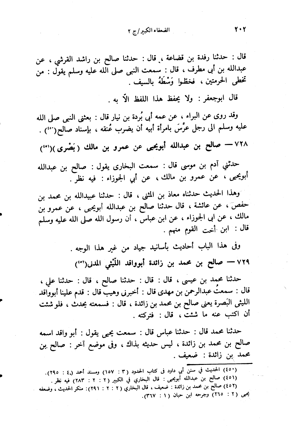§729 - صَالِحُ بْنُ مُحَمَّدِ بْنِ زَائِدَةَ أَبُو وَاقِدٍ اللَّيْثِيُّ الْمَدَنِيُّ حَدَّثَنَا أَبُو عَلِيٍّ مُحَمَّدُ بْنُ عِيسَى قَالَ: حَدَّثَنَا صَالِحٌ قَالَ: حَدَّثَنَا عَلِيٌّ قَالَ: سَمِعْتُ عَبْدَ الرَّحْمَنِ بْنَ مَهْدِيٍّ قَالَ: أَخْبَرَنِي وُهَيْبٌ قَالَ: قَدِمَ عَلَيْنَا أَبُو وَاقِدٍ اللَّيْثِيُّ الْبَصْرَةَ، يَعْنِي صَالِحَ بْنَ مُحَمَّدِ بْنِ زَائِدَةَ قَالَ: فَسَمِعْتُهُ يُحَدِّثُ، فَلَوْ شِئْتُ أَنْ أَكْتُبَ، عَنْهُ مَا شِئْتُ، قَالَ: فَتَرَكْتُهُ. حَدَّثَنَا مُحَمَّدٌ قَالَ: حَدَّثَنَا عَبَّاسٌ قَالَ: سَمِعْتُ يَحْيَى يَقُولُ: أَبُو وَاقِدٍ اسْمُهُ صَالِحُ بْنُ مُحَمَّدِ بْنِ زَائِدَةَ، لَيْسَ حَدِيثُهُ بِذَاكَ، وَفِي مَوْضِعٍ آخَرَ: صَالِحُ بْنُ مُحَمَّدِ بْنِ زَائِدَةَ ضَعِيفٌ. حَدَّثَنَا مُحَمَّدٌ قَالَ: حَدَّثَنَا مُعَاوِيَةُ بْنُ صَالِحٍ قَالَ: سَمِعْتُ يَحْيَى يَقُولُ: صَالِحُ بْنُ مُحَمَّدِ بْنِ زَائِدَةَ مَدَنِيٌّ ضَعِيفُ الْحَدِيثِ. حَدَّثَنِي آدَمُ بْنُ مُوسَى قَالَ: سَمِعْتُ الْبُخَارِيَّ قَالَ: صَالِحُ بْنُ مُحَمَّدِ بْنِ زَائِدَةَ أَبُو وَاقِدٍ اللَّيْثِيُّ الْمَدَنِيُّ، قَالَ الْبُخَارِيُّ: تَرَكَهُ سُلَيْمَانُ بْنُ حَرْبٍ، مُنْكَرُ الْحَدِيثِ