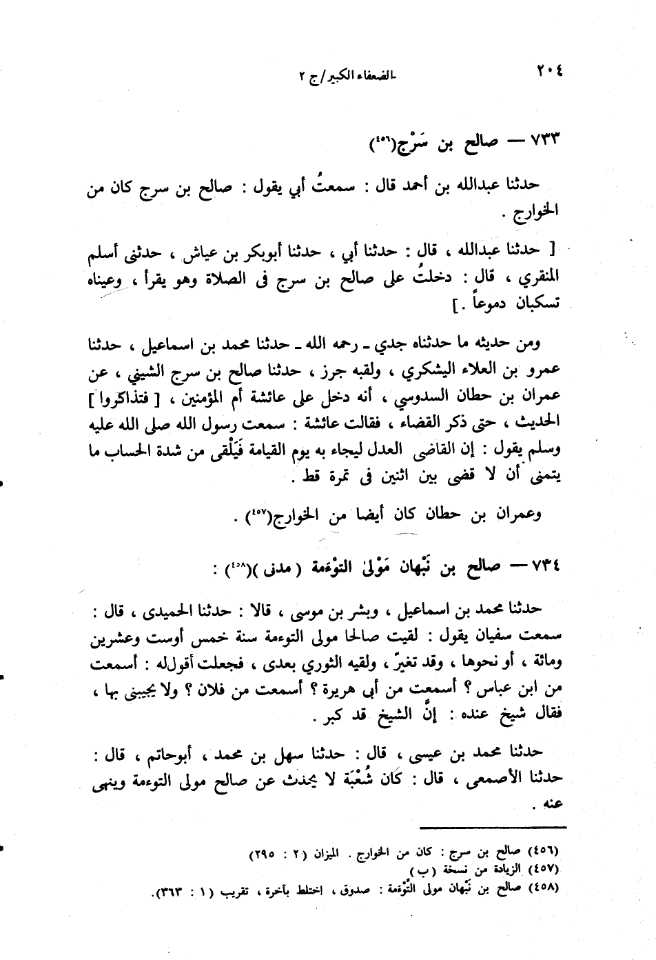 §733 - صَالِحُ بْنُ سَرْجٍ حَدَّثَنَا عَبْدُ اللَّهِ بْنُ أَحْمَدَ قَالَ: سَمِعْتُ أَبِي يَقُولُ: صَالِحُ بْنُ سَرْجٍ كَانَ مِنَ الْخَوَارِجِ أَرَى. حَدَّثَنَا عَبْدُ اللَّهِ قَالَ: حَدَّثَنَا أَبِي، حَدَّثَنَا أَبُو بَكْرِ بْنُ عَيَّاشٍ، حَدَّثَنِي أَسْلَمُ الْمِنْقَرِيُّ قَالَ: دَخَلْتُ عَلَى صَالِحِ بْنِ سَرْجٍ فِي الصَّلَاةِ وَهُوَ يَقْرَأُ، وَعَيْنَاهُ تَسْكُبَانِ دُمُوعًا