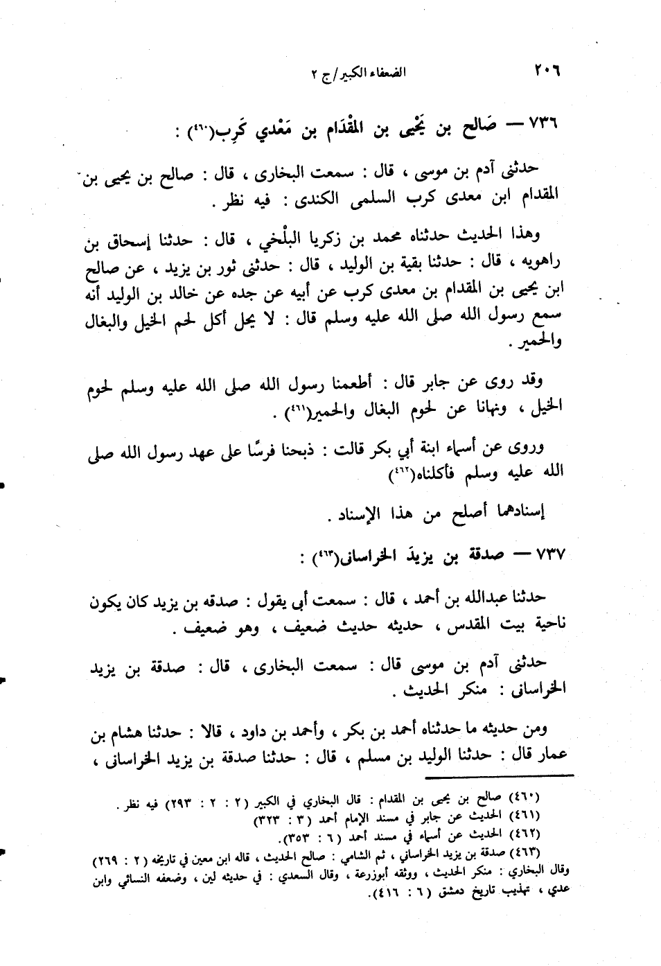 §736 - صَالِحُ بْنُ يَحْيَى بْنِ الْمِقْدَامِ بْنِ مَعْدِي كَرِبَ حَدَّثَنِي آدَمُ بْنُ مُوسَى قَالَ: سَمِعْتُ الْبُخَارِيَّ قَالَ: صَالِحُ بْنُ يَحْيَى بْنِ الْمِقْدَامِ بْنِ مَعْدِي كَرِبَ الشَّامِيُّ الْكِنْدِيُّ فِيهِ نَظَرٌ