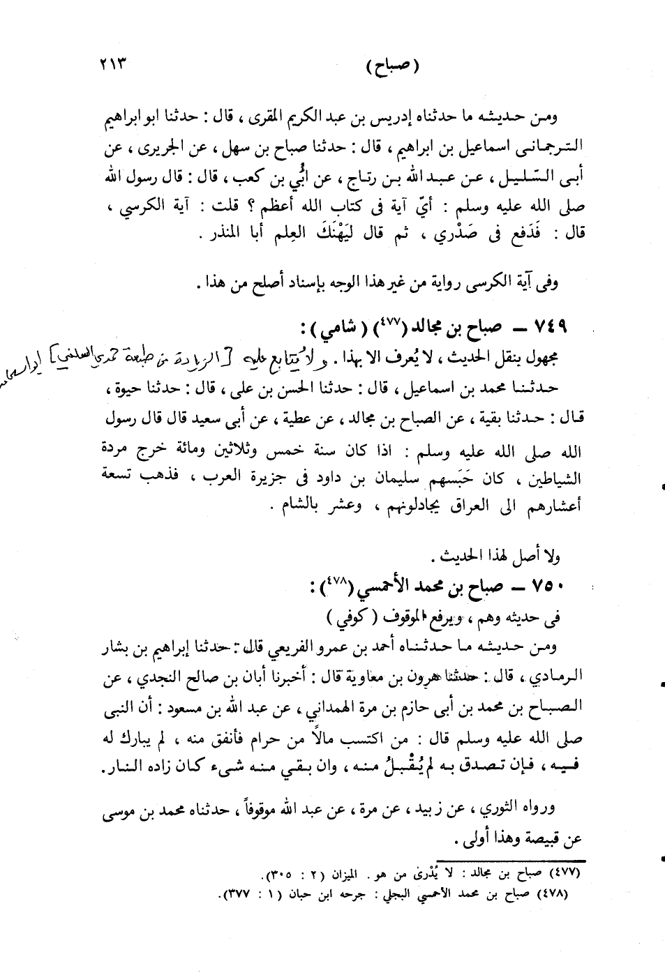 §749 - صَبَاحُ بْنُ مُجَالِدٍ شَامِيُّ مَجْهُولٌ بِنَقْلِ الْحَدِيثِ، لَا يُعْرَفُ إِلَّا بِهَذَا وَلَا يُتَابَعُ عَلَيْهِ
