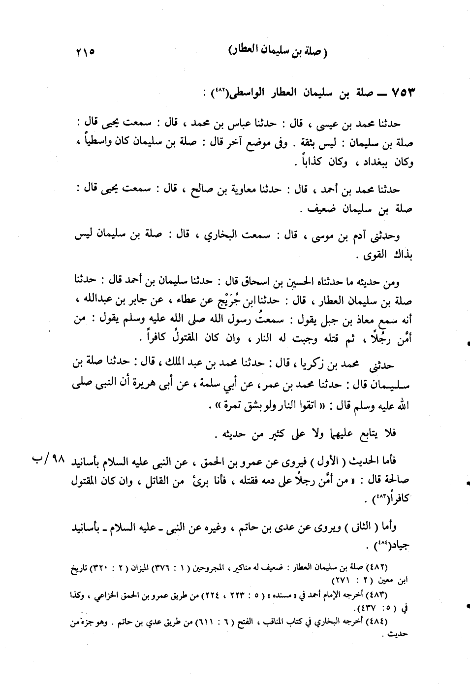 §753 - صِلَةُ بْنُ سُلَيْمَانَ الْعَطَّارُ الْوَاسِطِيُّ حَدَّثَنَا مُحَمَّدُ بْنُ عِيسَى قَالَ: حَدَّثَنَا عَبَّاسُ بْنُ مُحَمَّدٍ قَالَ: سَمِعْتُ يَحْيَى قَالَ: صِلَةُ بْنُ سُلَيْمَانَ لَيْسَ بِثِقَةٍ، وَفِي مَوْضِعٍ آخَرَ قَالَ: صِلَةُ بْنُ سُلَيْمَانَ كَانَ وَاسِطِيًّا، وَكَانَ بِبَغْدَادَ وَكَانَ كَذَّابًا. حَدَّثَنَا مُحَمَّدُ بْنُ أَحْمَدَ قَالَ: حَدَّثَنَا مُعَاوِيَةُ بْنُ صَالِحٍ قَالَ: سَمِعْتُ يَحْيَى قَالَ: صِلَةُ بْنُ سُلَيْمَانَ ضَعِيفٌ. وَحَدَّثَنِي آدَمُ بْنُ مُوسَى قَالَ: سَمِعْتُ الْبُخَارِيَّ قَالَ: صِلَةُ بْنُ سُلَيْمَانَ لَيْسَ بِذَاكَ الْقَوِيِّ