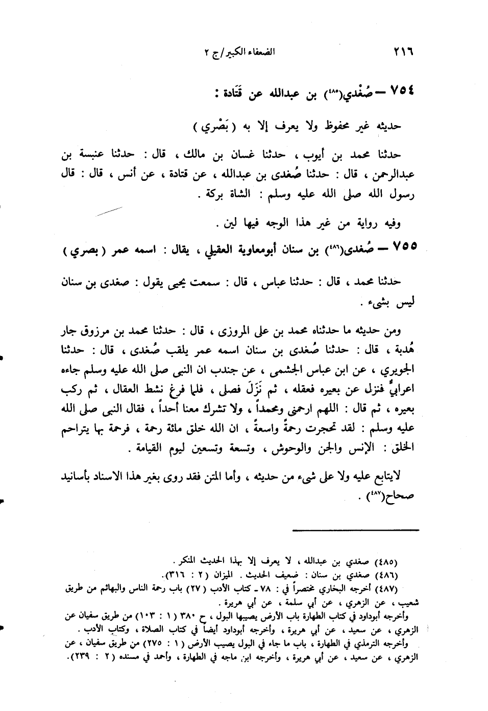 §755 - صُغْدِيُّ بْنُ سِنَانٍ أَبُو مُعَاوِيَةَ الْعُقَيْلِيُّ يُقَالُ اسْمُهُ عُمَرُ، بَصْرِيٌّ. حَدَّثَنَا مُحَمَّدٌ قَالَ: حَدَّثَنَا عَبَّاسٌ قَالَ: سَمِعْتُ يَحْيَى، يَقُولُ: صُغْدِيُّ بْنُ سِنَانٍ لَيْسَ بِشَيْءٍ