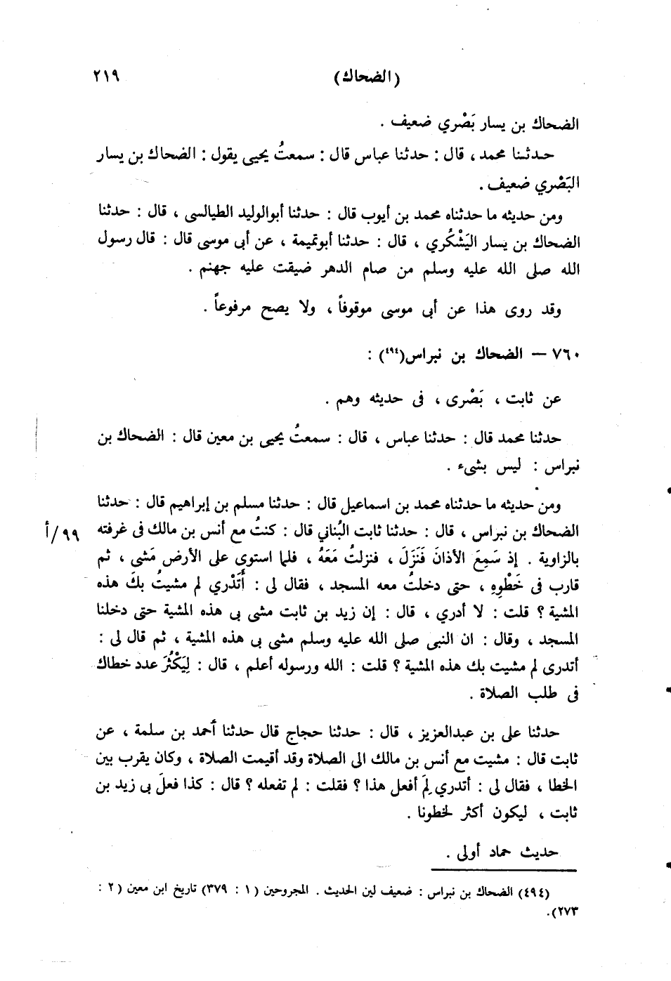 §760 - الضَّحَّاكُ بْنُ نِبْرَاسٍ عَنْ ثَابِتٍ بَصْرِيٌّ فِي حَدِيثِهِ وَهْمٌ. حَدَّثَنَا مُحَمَّدٌ قَالَ: حَدَّثَنَا عَبَّاسٌ قَالَ: سَمِعْتُ يَحْيَى بْنَ مَعِينٍ قَالَ: الضَّحَّاكَ بْنُ نِبْرَاسٍ لَيْسَ بِشَيْءٍ