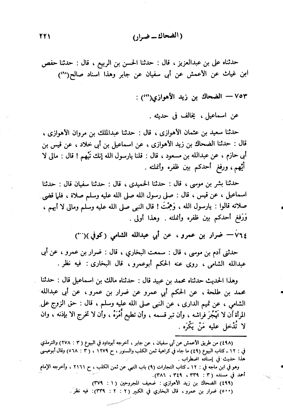 §764 - ضِرَارُ بْنُ عَمْرٍو عَنْ أَبِي عَبْدِ اللَّهِ الشَّامِيِّ، كُوفِيٌّ. حَدَّثَنِي آدَمُ بْنُ مُوسَى قَالَ: سَمِعْتُ الْبُخَارِيَّ قَالَ: ضِرَارُ بْنُ عَمْرٍو، عَنْ أَبِي عَبْدِ اللَّهِ الشَّامِيِّ، رَوَى عَنْهُ الْحَكَمُ أَبُو عَمْرٍو، قَالَ الْبُخَارِيُّ: فِيهِ نَظَرٌ