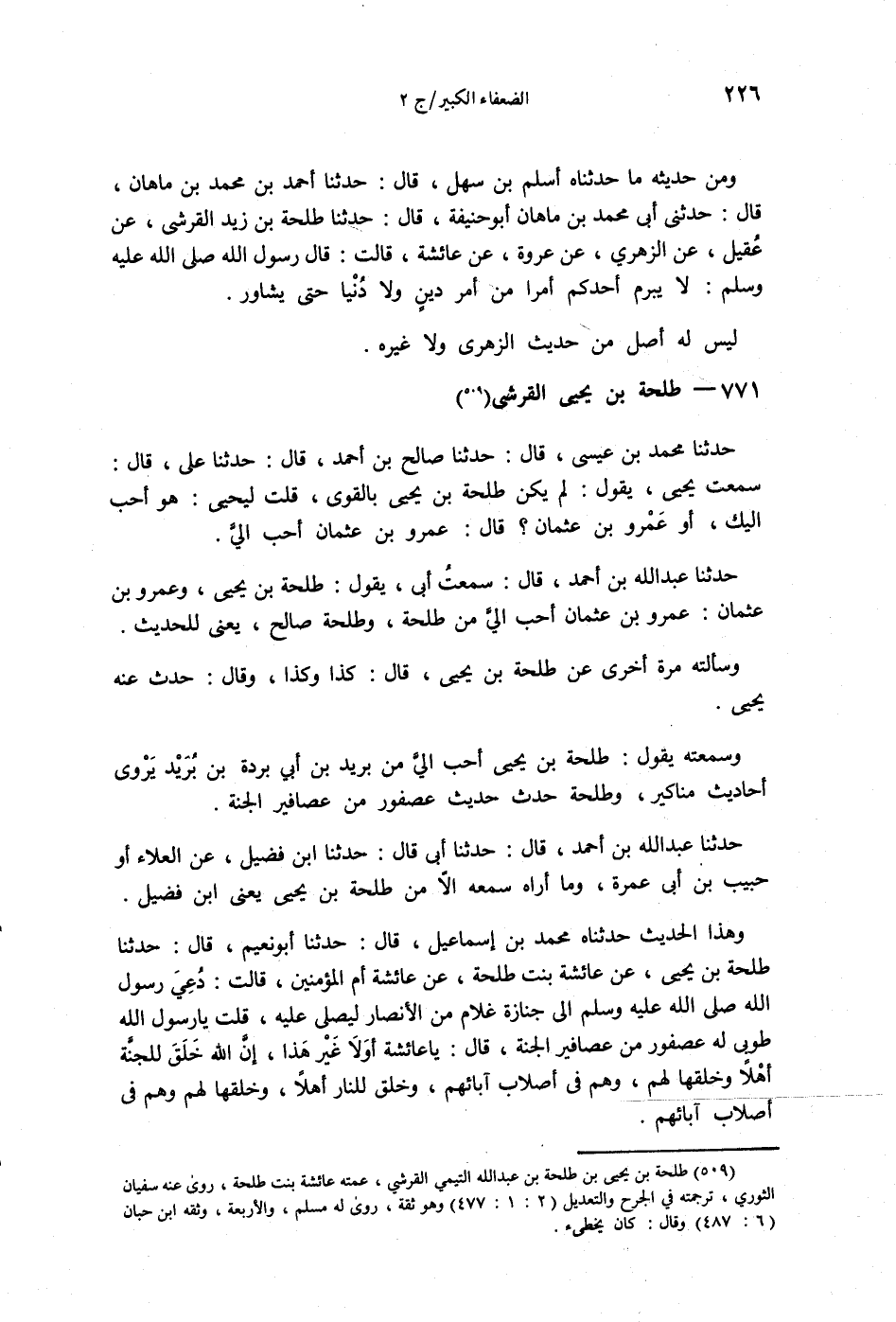 §771 - طَلْحَةُ بْنُ يَحْيَى الْقُرَشِيُّ حَدَّثَنَا مُحَمَّدُ بْنُ عِيسَى قَالَ: حَدَّثَنَا صَالِحُ بْنُ أَحْمَدَ قَالَ: حَدَّثَنَا عَلِيٌّ قَالَ: سَمِعْتُ يَحْيَى يَقُولُ: لَمْ يَكُنْ طَلْحَةُ بْنُ يَحْيَى بِالْقَوِيِّ، قُلْتُ لِيَحْيَى: هُوَ أَحَبُّ إِلَيْكَ أَوْ عَمْرُو بْنُ عُثْمَانَ؟ قَالَ: عَمْرُو بْنُ عُثْمَانَ أَحَبُّ إِلَيَّ. حَدَّثَنَا عَبْدُ اللَّهِ بْنُ أَحْمَدَ قَالَ: سَمِعْتُ أَبِي يَقُولُ: طَلْحَةُ بْنُ يَحْيَى، وَعَمْرُو بْنُ عُثْمَانَ: عَمْرُو بْنُ عُثْمَانَ أَحَبُّ إِلَيَّ مِنْ طَلْحَةَ، وَطَلْحَةُ صَالِحٌ، يَعْنِي الْحَدِيثَ. وَسَأَلْتُهُ مَرَّةً أُخْرَى عَنْ طَلْحَةَ بْنِ يَحْيَى قَالَ: كَذَا وَكَذَا، وَقَالَ: حَدَّثَ عَنْهُ يَحْيَى، وَسَمِعْتُهُ يَقُولُ: طَلْحَةُ بْنُ يَحْيَى أَحَبُّ إِلَيَّ مِنْ بُرَيْدِ بْنِ أَبِي مَرْيَمَ، بُرَيْدٍ يَرْوِي أَحَادِيثَ مَنَاكِيرَ، وَطَلْحَةُ حَدَّثَ حَدِيثَ: عُصْفُورٌ مِنْ عَصَافِيرِ الْجَنَّةِ. حَدَّثَنَا عَبْدُ اللَّهِ بْنُ أَحْمَدَ قَالَ: حَدَّثَنَا أَبِي قَالَ: حَدَّثَنَا ابْنُ فُضَيْلٍ، عَنِ الْعَلَاءِ، أَوْ حَبِيبِ بْنِ أَبِي عَمْرَةَ، وَمَا أُرَاهُ سَمِعَهُ إِلَّا مِنْ طَلْحَةَ بْنِ يَحْيَى يَعْنِي ابْنَ فُضَيْلٍ